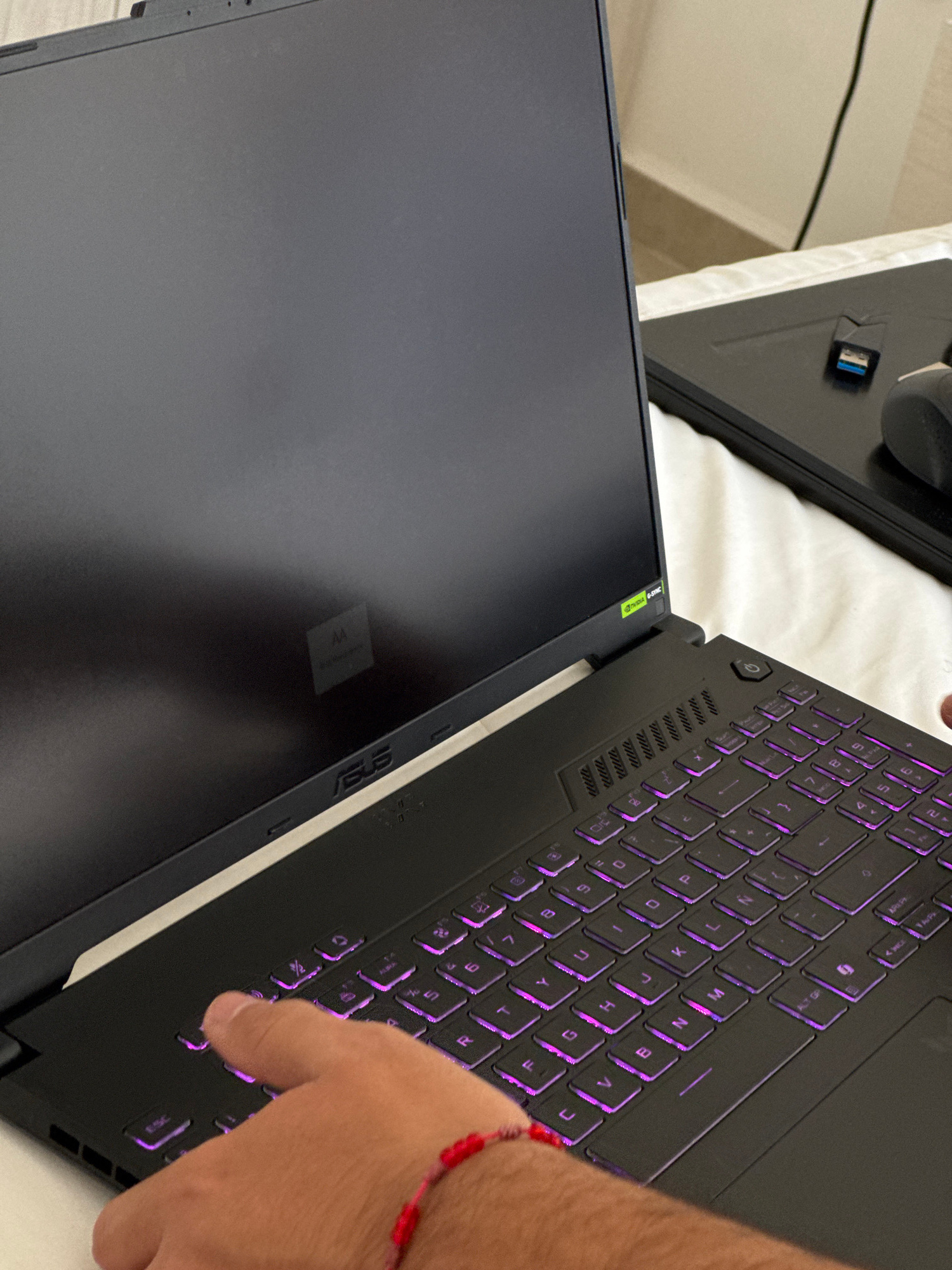 A high-angle, close-up shot depicts two open ASUS laptops on what appears to be a white bed or cloth surface. The laptop on the right features a backlit keyboard, with the keys illuminated in a purpl…read more