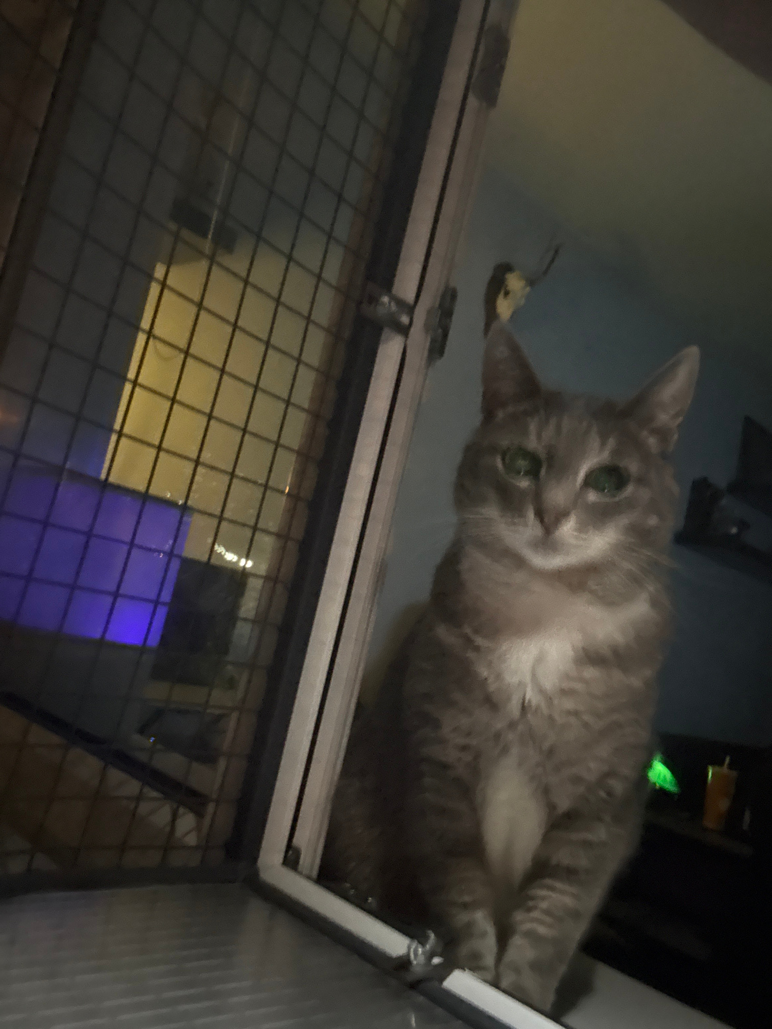 A gray tabby cat is perched on top of a metal cage. The cat is looking down at the viewer with green eyes. The cage is visible in the foreground, featuring a grid-like pattern. In the background, an i…read more