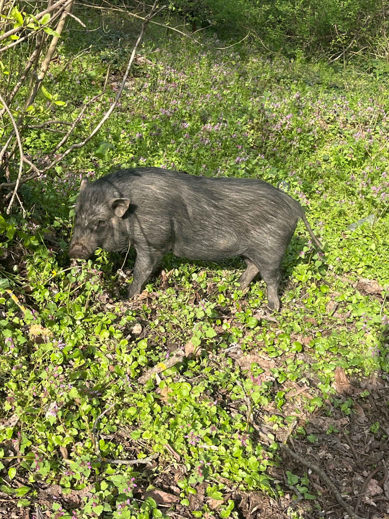 The image shows a single wild boar lying on the ground covered with green vegetation and some purple flowers. The location appears to be a wooded or grassy area with trees and shrubs visible in the ba…read more