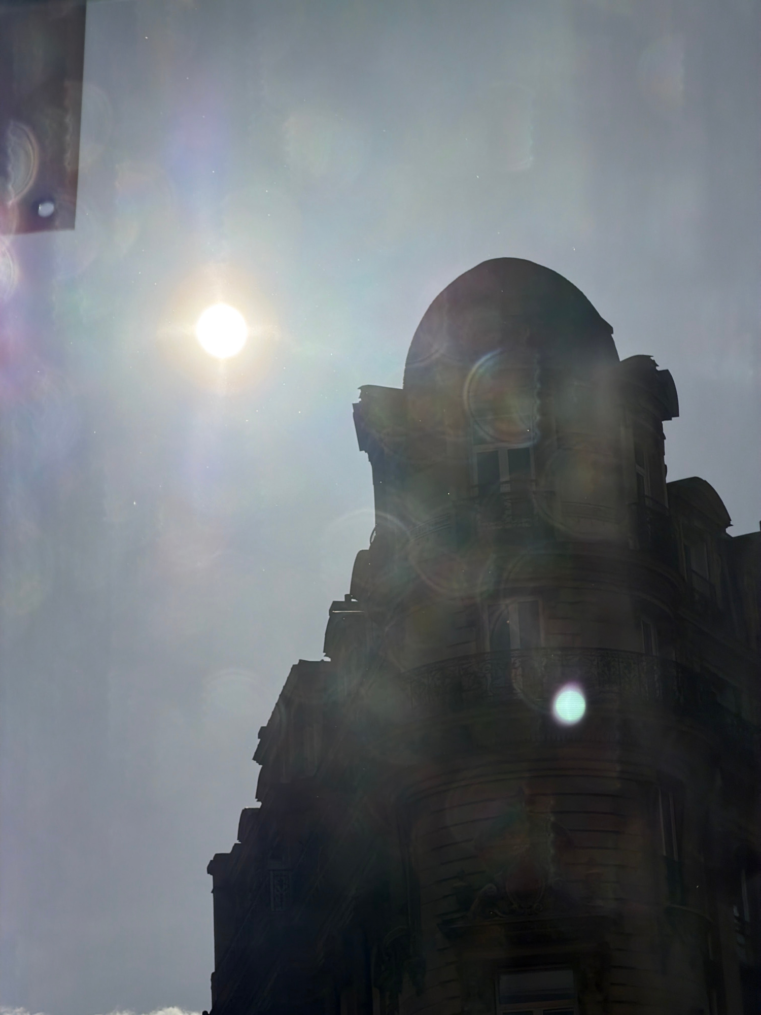 The image captures a massive, dark, cylindrical or drum-shaped structure viewed from a low angle against a bright, overcast sky. The structure, possibly a building or an industrial complex, is heavily…read more