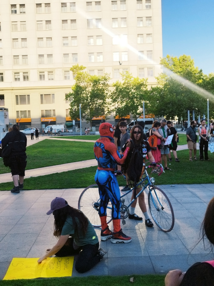 A person dressed as Spider-Man stands with a blue Bianchi bicycle. A girl wearing a plaid skirt stands with the bike as well. A building is in the background, and there are trees. A woman kneels on th…read more