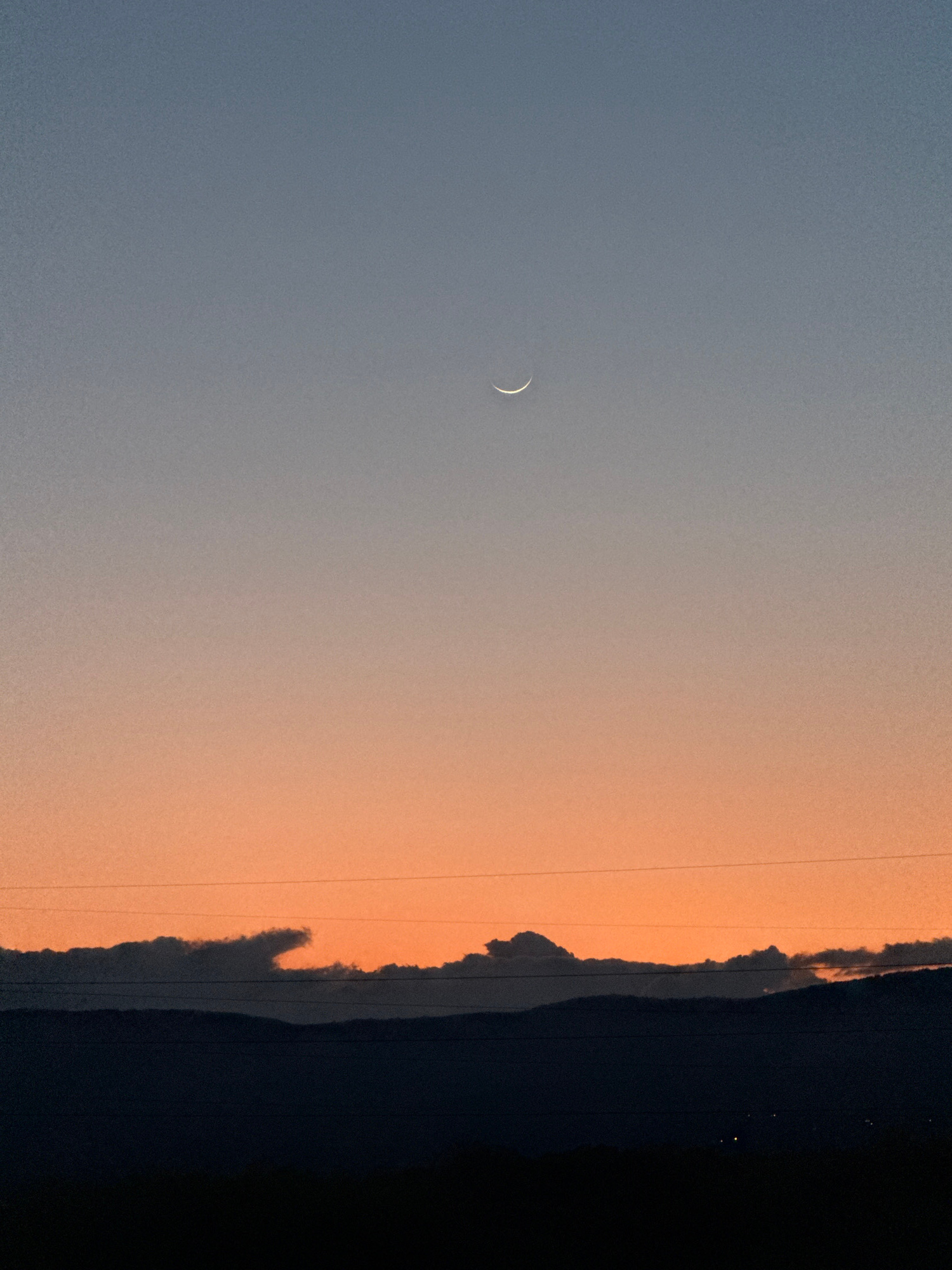 The image depicts a twilight sky with a crescent moon visible in the upper left quadrant. The sky transitions from a pale blue-grey on the left to an orange hue towards the right. A dark, vertical sha…read more