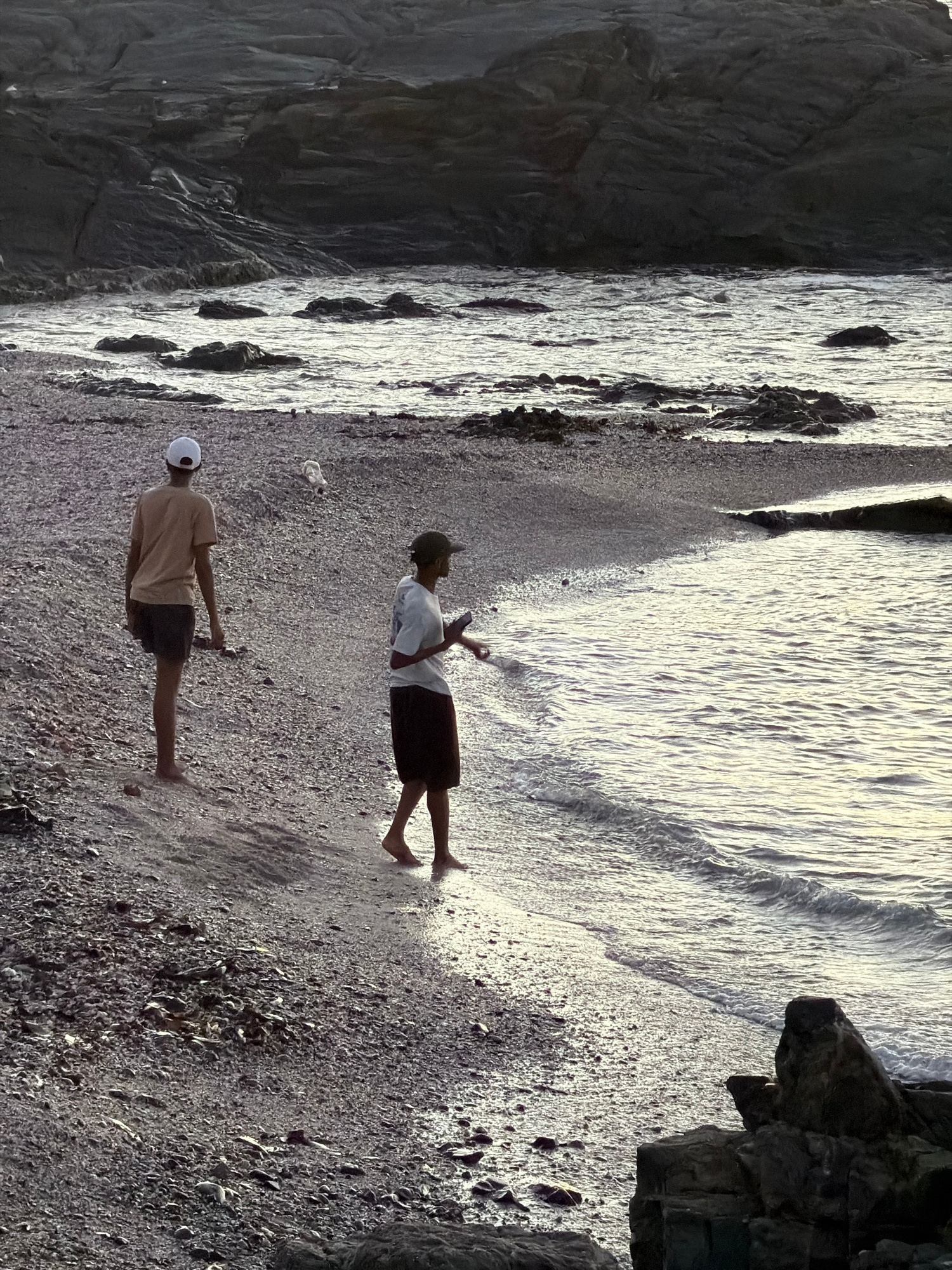 Two people are standing on a pebble-covered beach beside ocean water and under the face of a cliff. One individual is wearing a cap, T-shirt, and shorts, while the other person is dressed similarly. T…read more