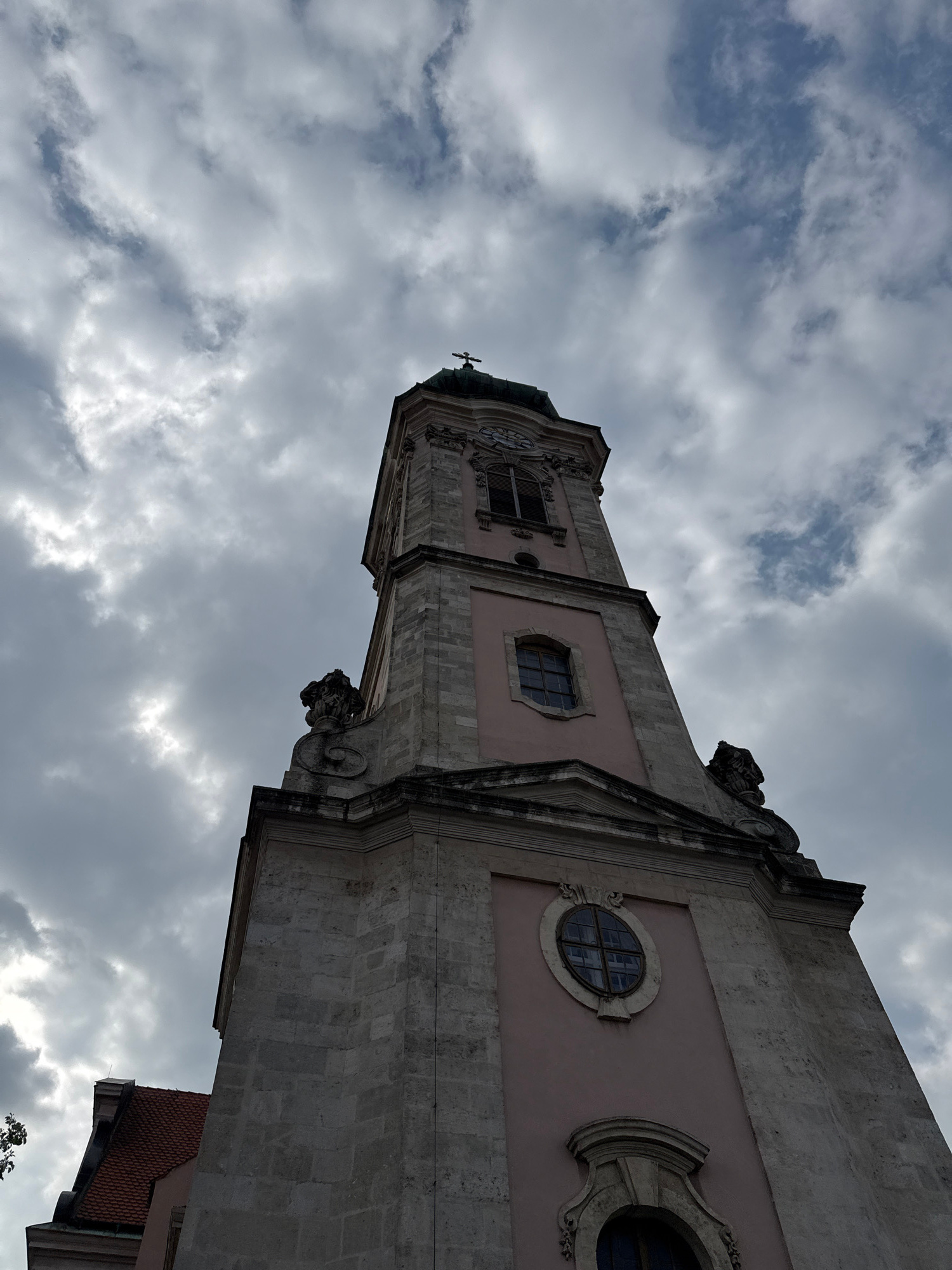 An upward-facing, low-angle photograph captures a section of a grand historical building, likely a church tower, against a cloudy sky in Hainburg an der Donau, Austria. The building, rendered in a dyn…read more