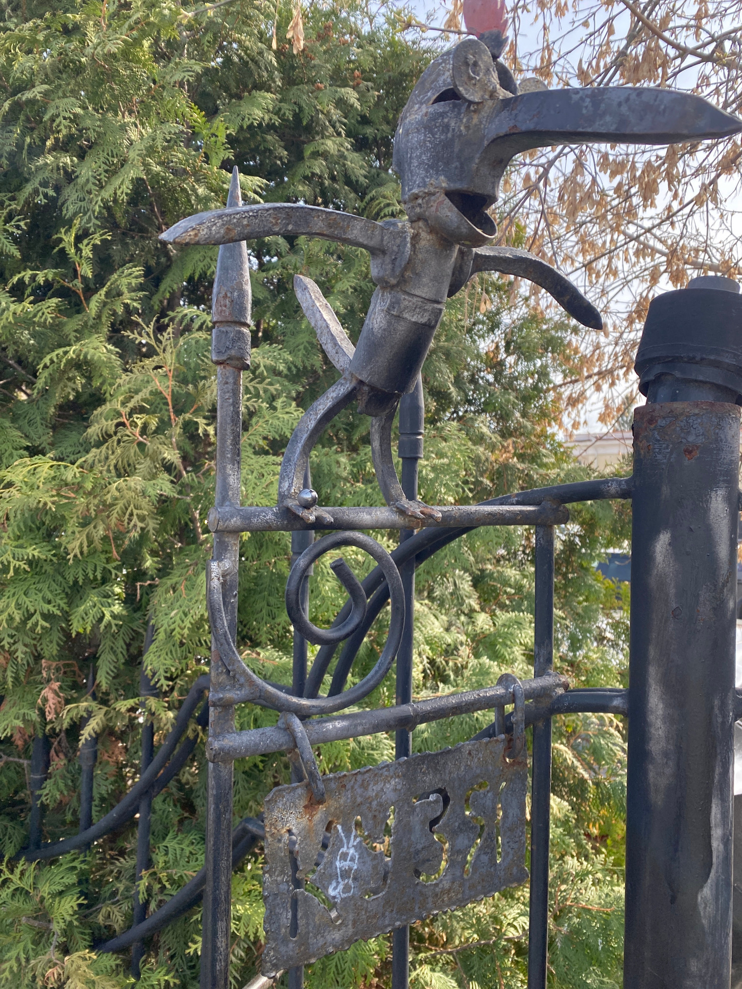 This image shows a fragment of a metal fence in Yekaterinburg, Russia. The fence features decorative elements including spear-shaped spikes and a curly design. A rusty metal plate is attached to the f…read more