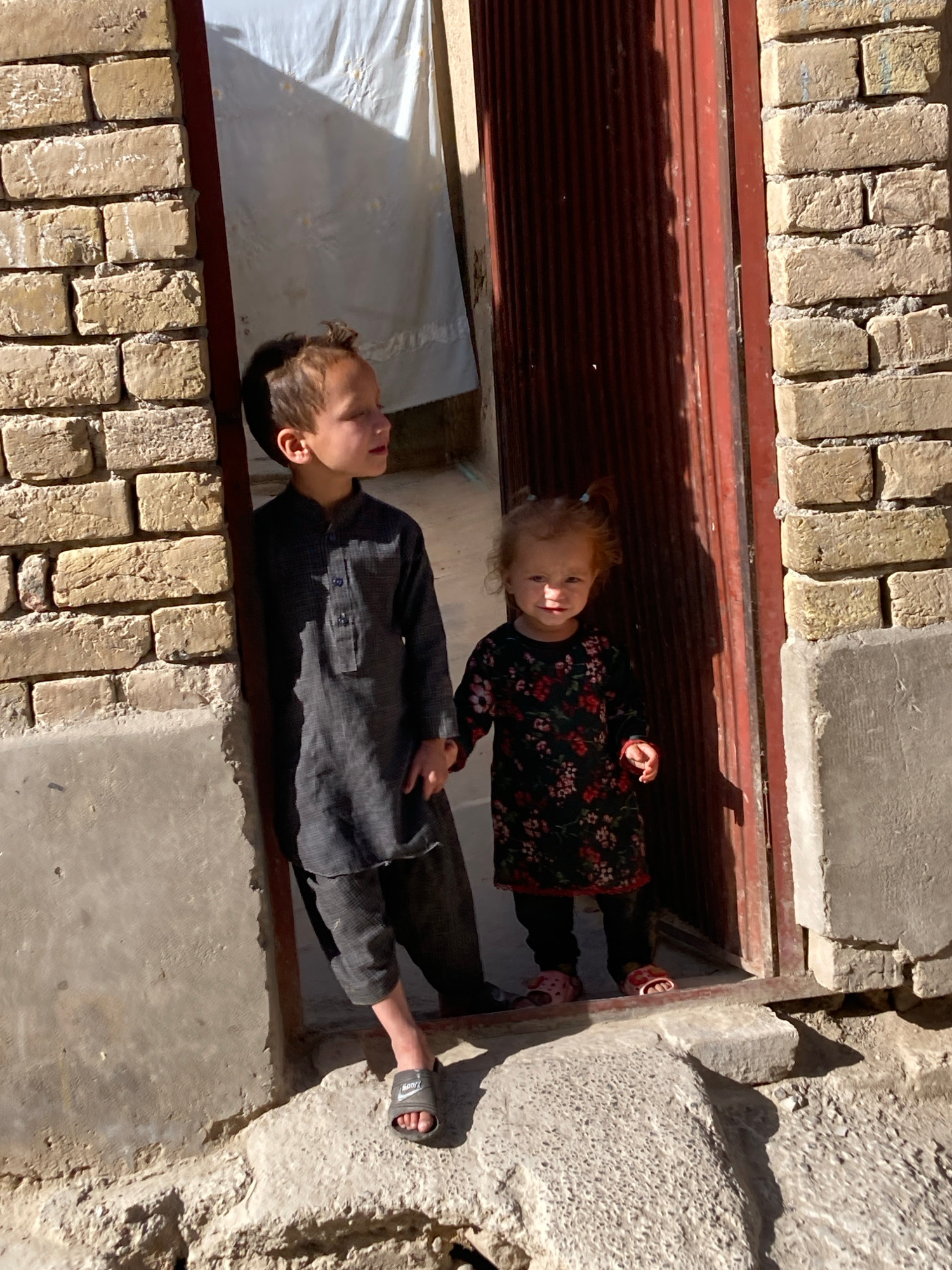 Two children, a boy and a girl, are positioned in what appears to be a recessed area or doorway of a building. The building appears to be made of concrete and brick. The area is partially enclosed by…read more