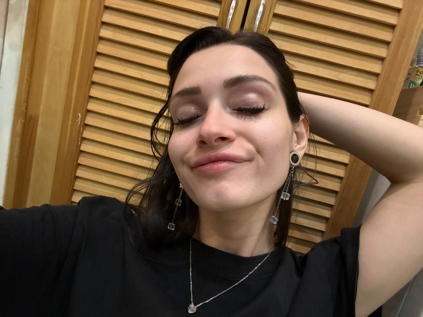 A woman with dark hair, fair skin, and closed eyes lies on a light brown, slatted surface. She wears a black t-shirt and a silver chain headpiece with clear beads. The left side of her head rests on h…read more