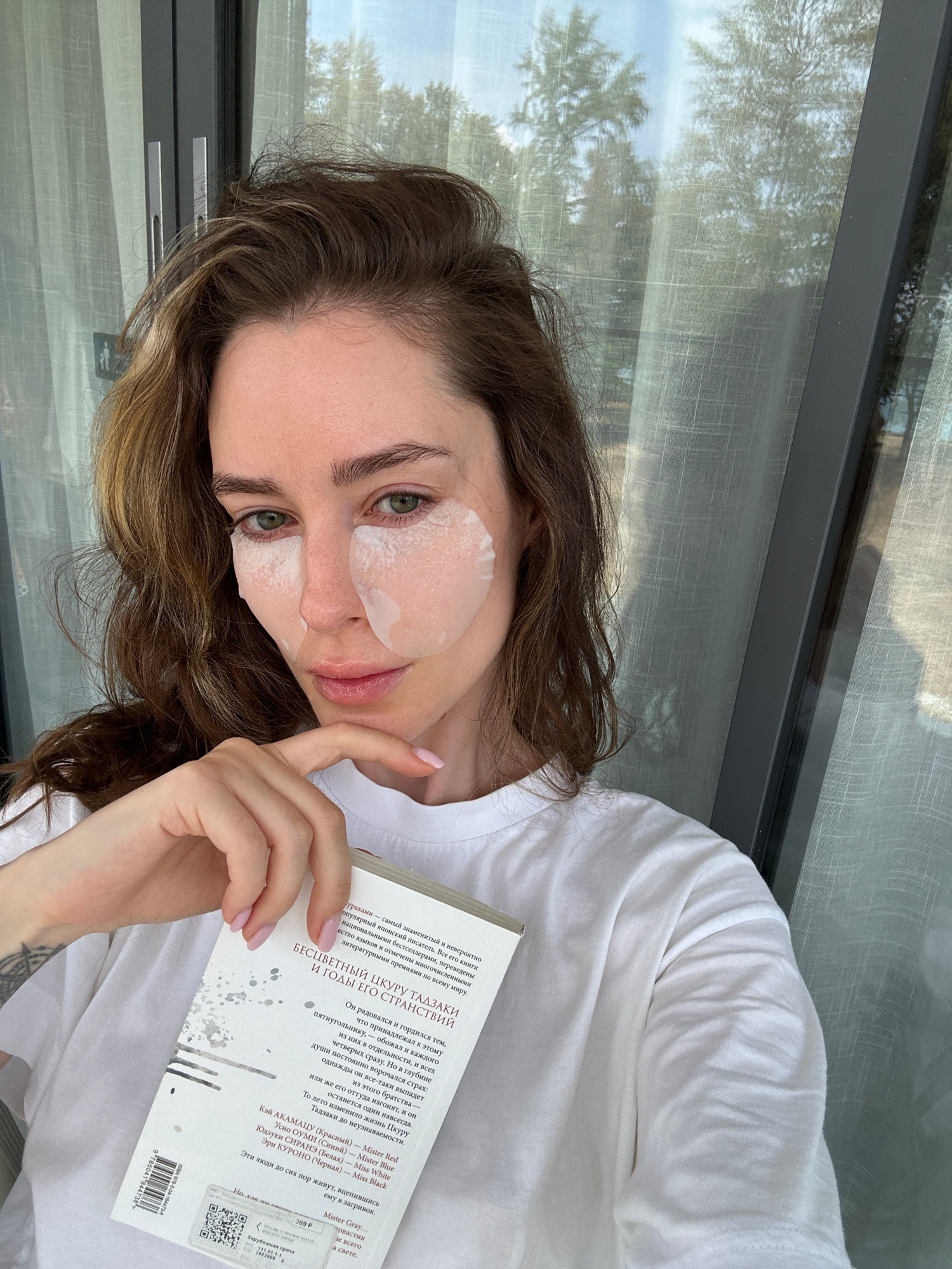 Here's a detailed description of the image: **Scene:** An indoor shot featuring a woman posing with a book. The setting appears to be near a window, as suggested by the reflected trees visible throug…read more