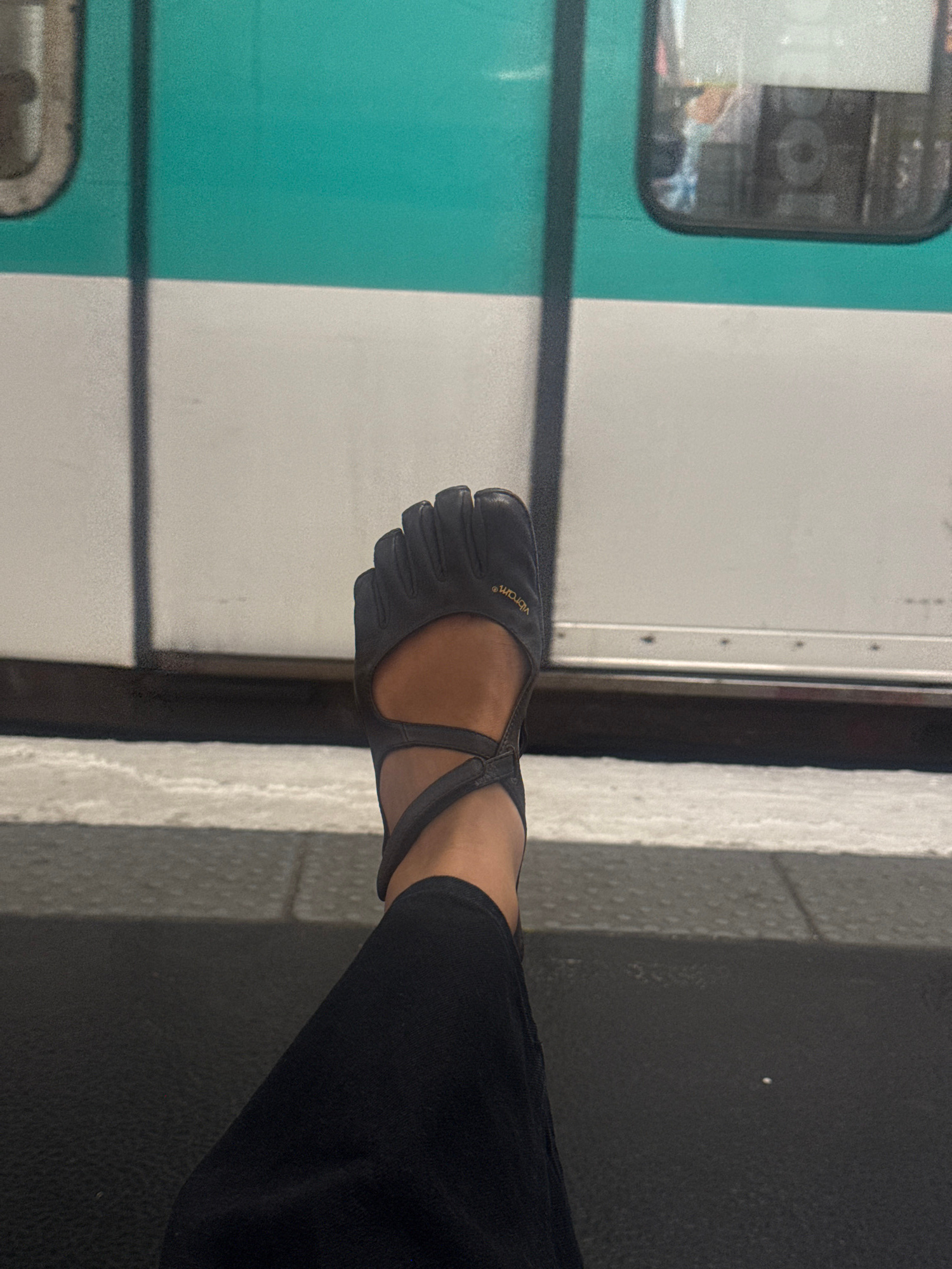 A person is standing on a metro platform, wearing black pants and a black Vibram FiveFingers shoe. The platform is tiled in gray. Behind the person, there is a train with a green and white exterior. T…read more
