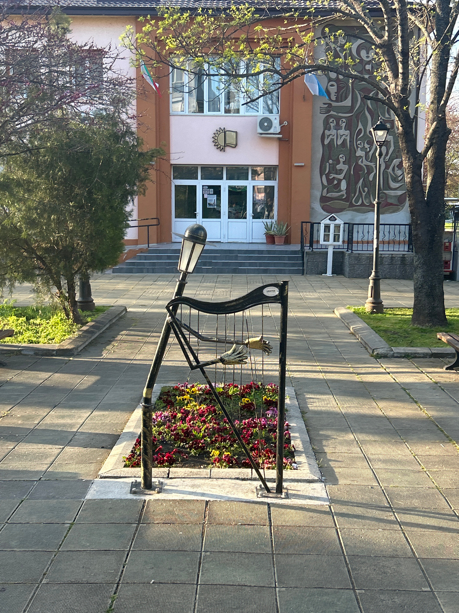 The image displays an outdoor public area, likely in front of a public building in Pomorie, Bulgaria. The central feature is a multi-story building with a light peach-colored lower facade and a lighte…read more