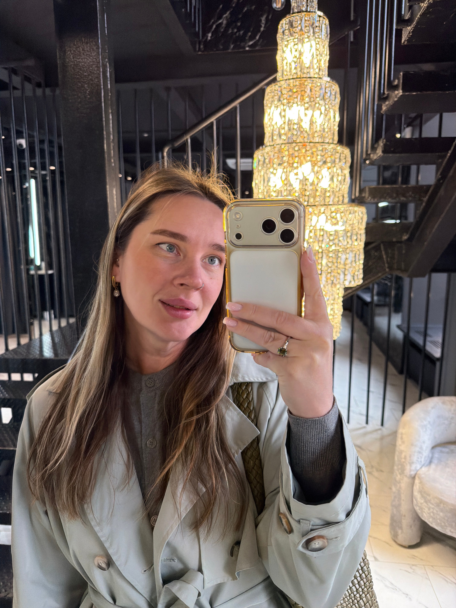 A woman is taking a selfie indoors. She is holding a smartphone, in front of her face. The background includes a tiered chandelier, a black metal staircase, and other furniture. It is not possible to…read more