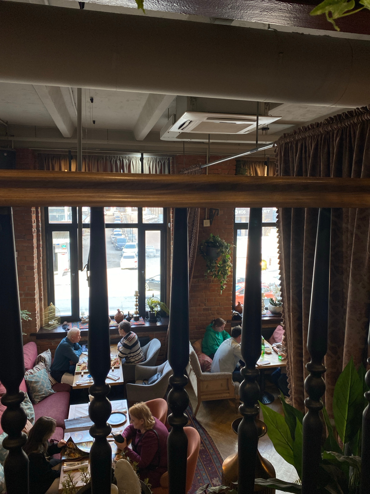 The image, taken from a high vantage point, possibly an upper floor or balcony, offers a view of an interior space with numerous people seated at tables. The location is Ufa, Russia. The interior is a…read more