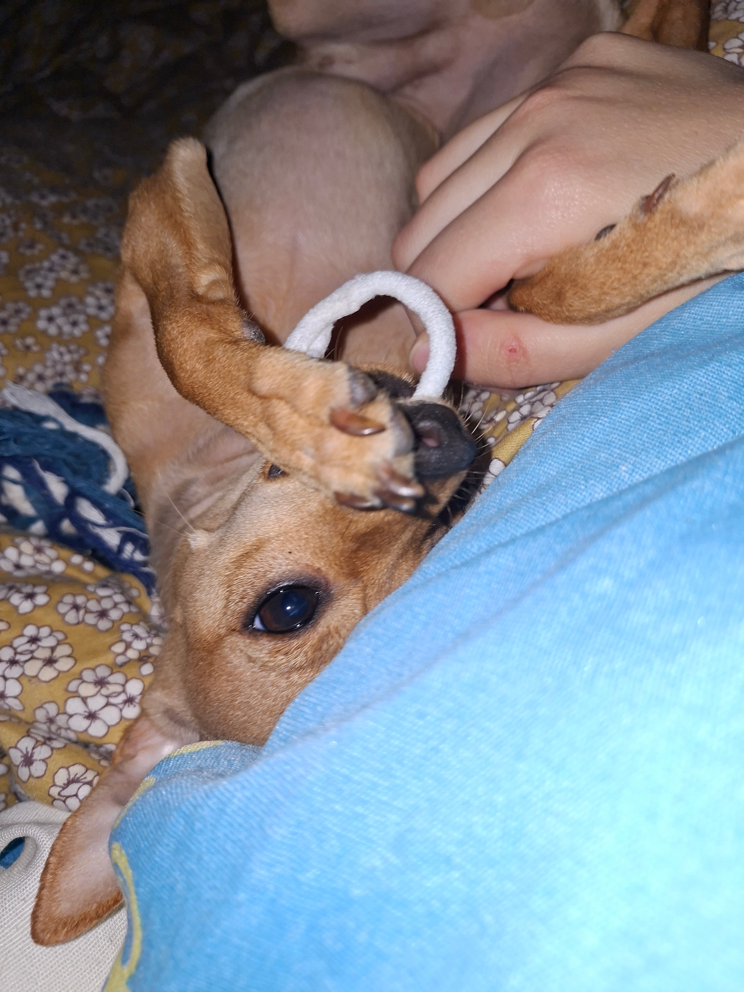 A tan Chihuahua dog lies on a patterned blanket, partially obscured by a blue blanket. The dog holds a white hair tie in its paw. A human hand is visible, holding the dog's leg. The photograph appears…read more