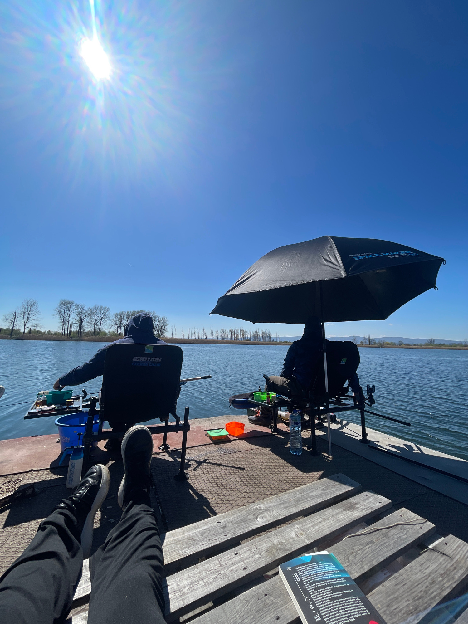 The image depicts two individuals fishing on a wooden platform near a body of water, likely a lake or river. One person is seated under a large black umbrella. The second person is shown with their fe…read more