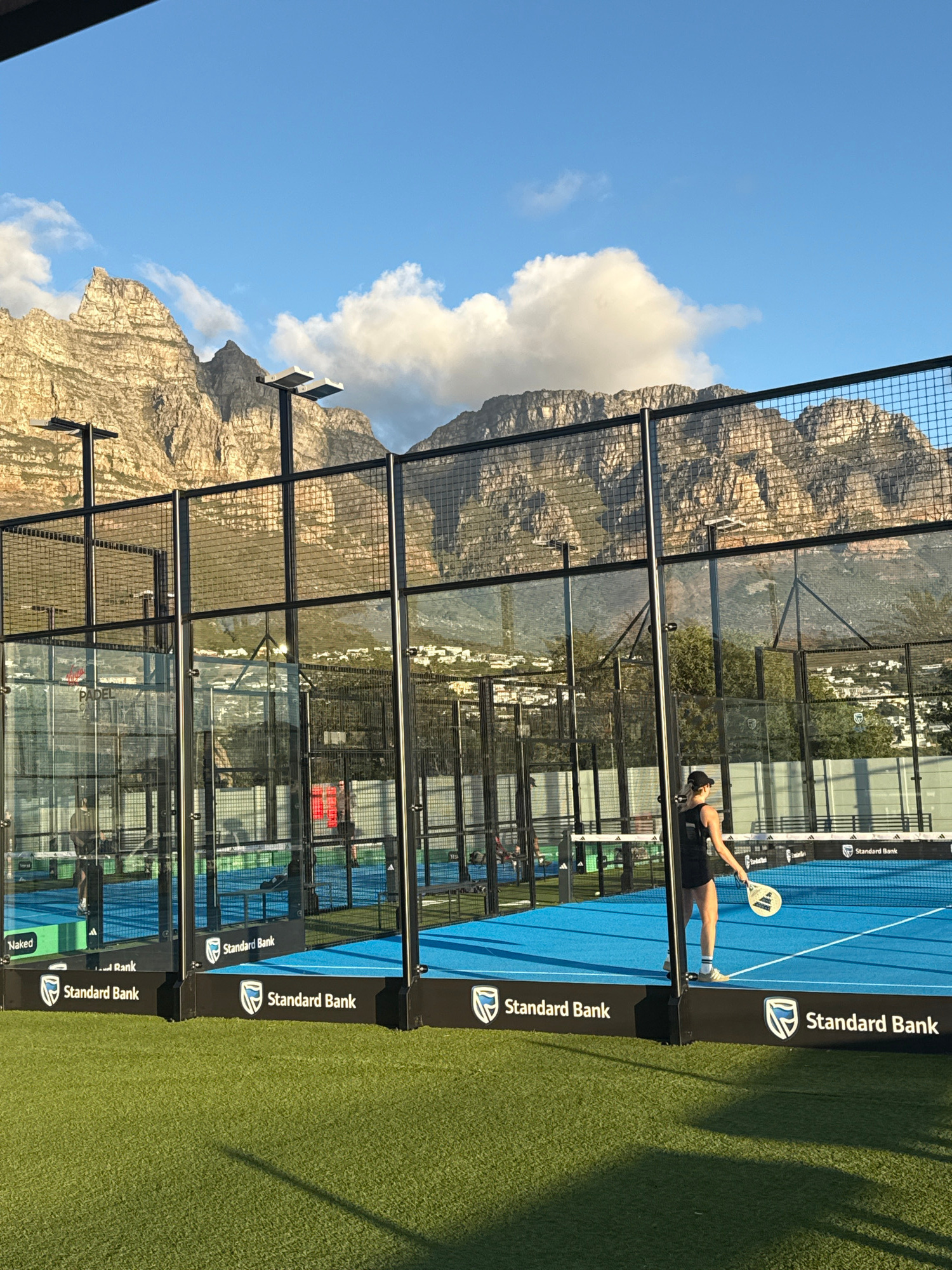 The image captures a paddle tennis court in Cape Town, South Africa, set against the backdrop of Table Mountain. A female figure stands on the court, holding a paddle, poised as if about to strike a b…read more