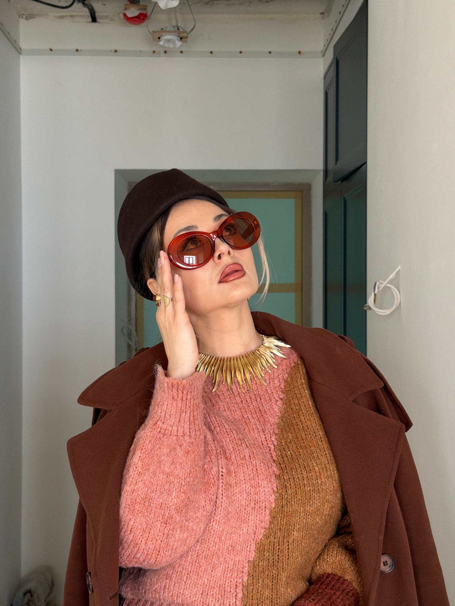 A woman is oriented sideways in an indoor setting. She is wearing a dark brown beret, round red sunglasses, a striped sweater of pink and brown hues, and a brown coat. She is also wearing a gold colla…read more