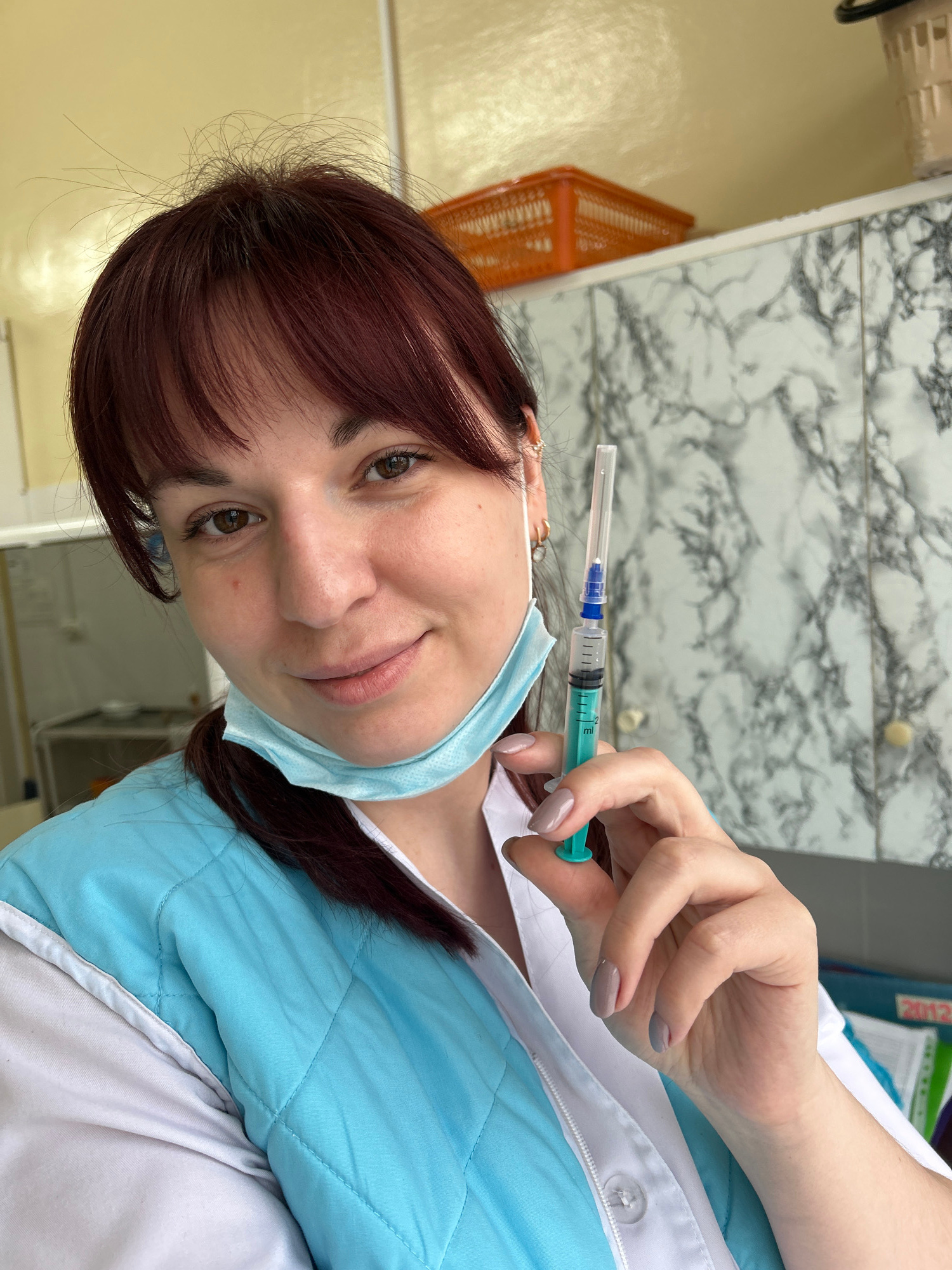 A woman in a blue and white medical coat holds a syringe with a needle in her right hand, while wearing a surgical mask pulled down under her chin. She has brown eyes and maroon hair with bangs. The b…read more