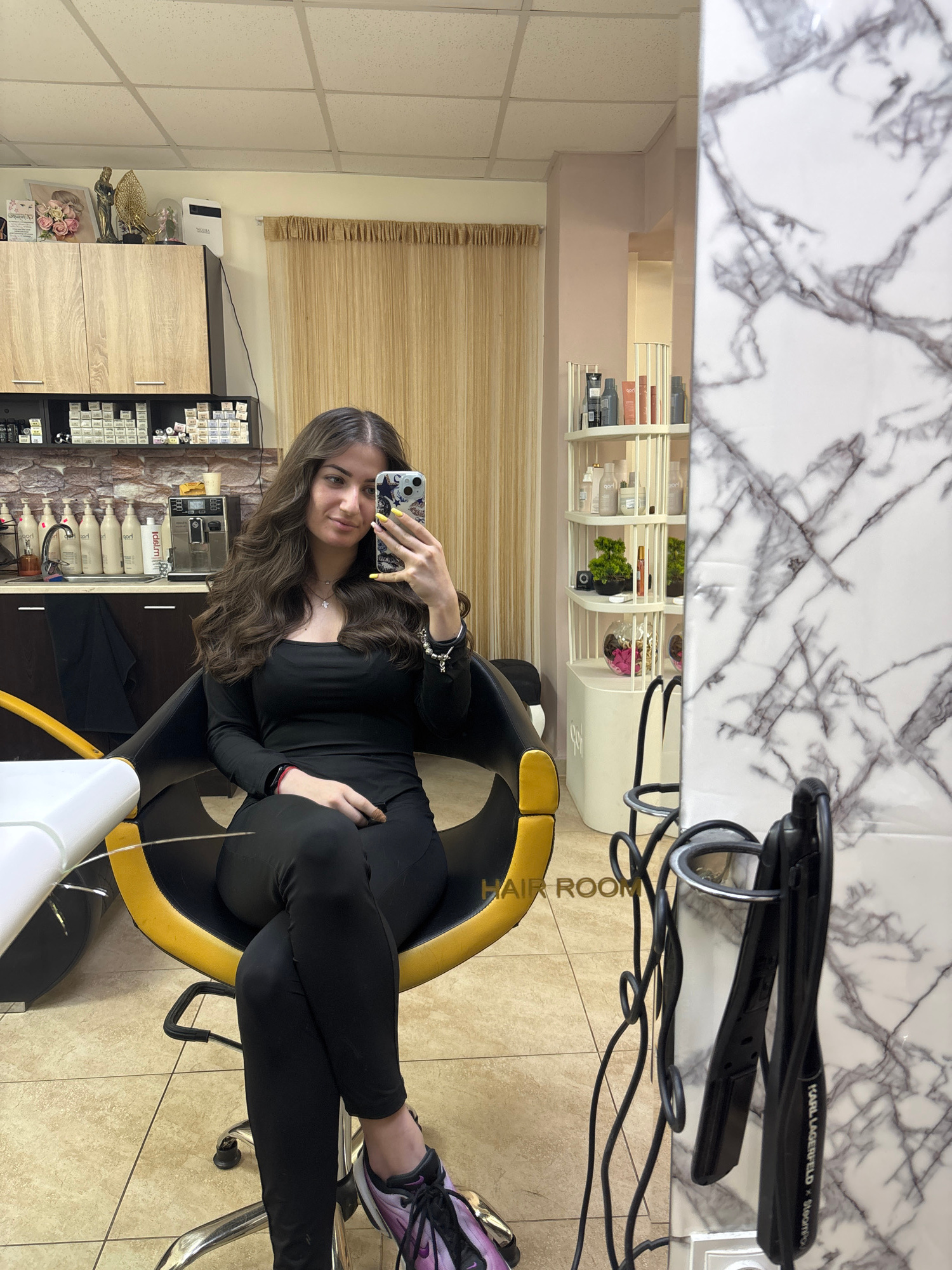 A young woman is captured in a mirror selfie, seated in a salon chair within what appears to be a hair salon in Chirpan, Bulgaria. She has long, wavy brown hair, wears a black long-sleeved top, black…read more