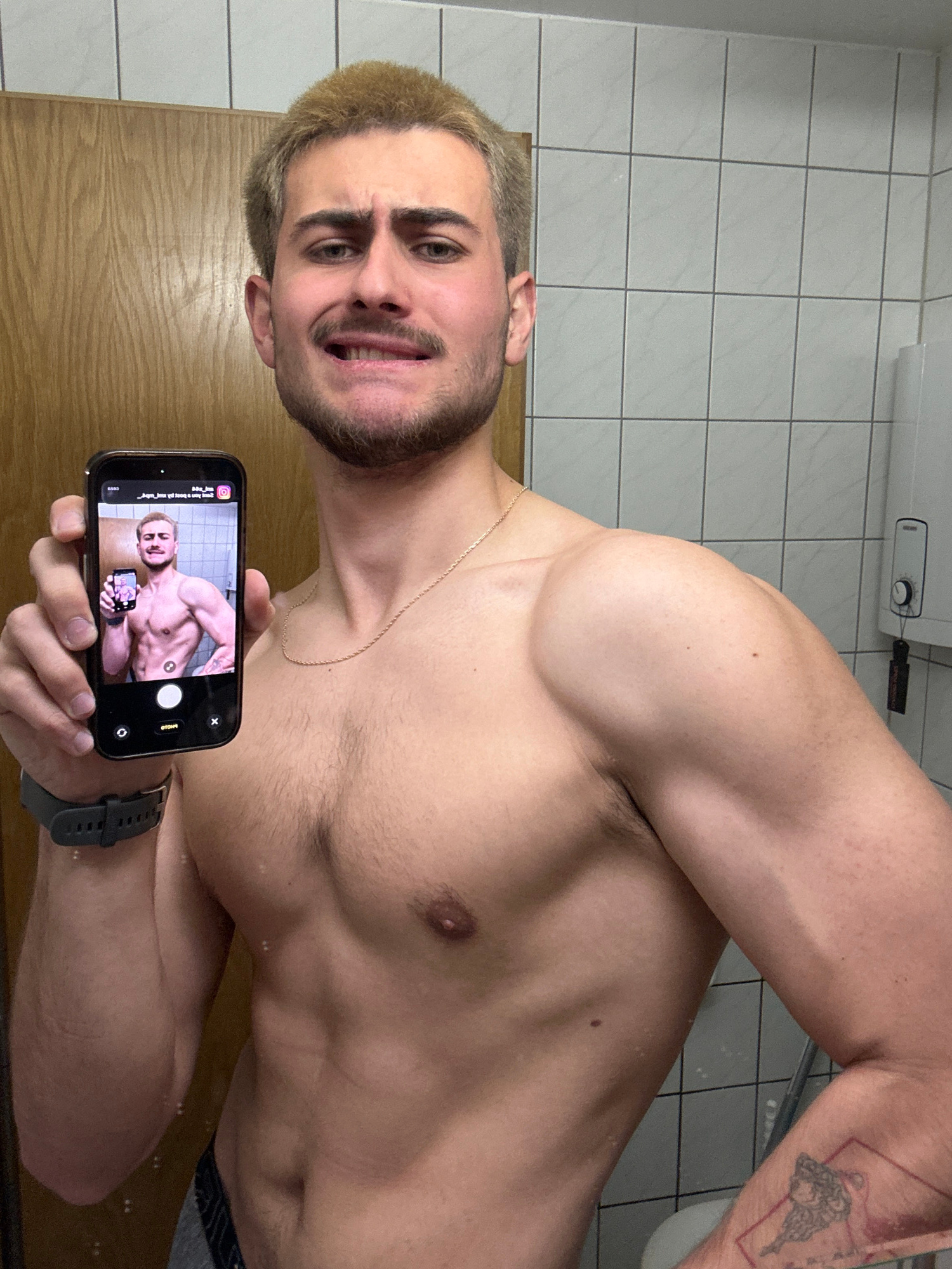 A shirtless man is in a bathroom, holding a smartphone in his hand, taking a selfie. He has short blonde hair and a beard. He is wearing a watch on his wrist and a thin gold chain around his neck. His…read more