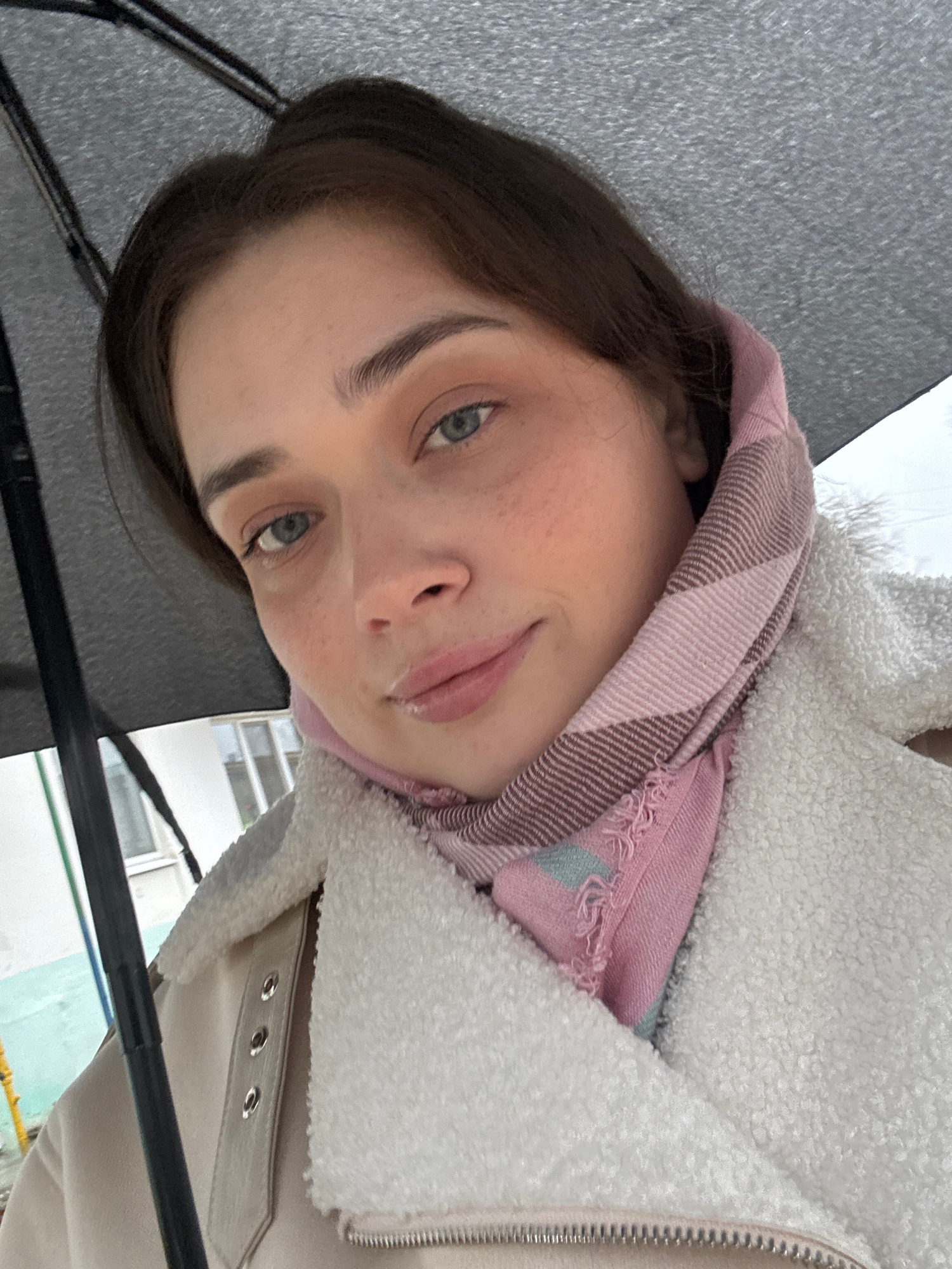 A young woman is featured in a close-up, upward-angled portrait, likely a selfie, taken outdoors. She has dark hair, light-colored eyes (appearing greenish-blue), and fair skin with freckles. Her lips…read more