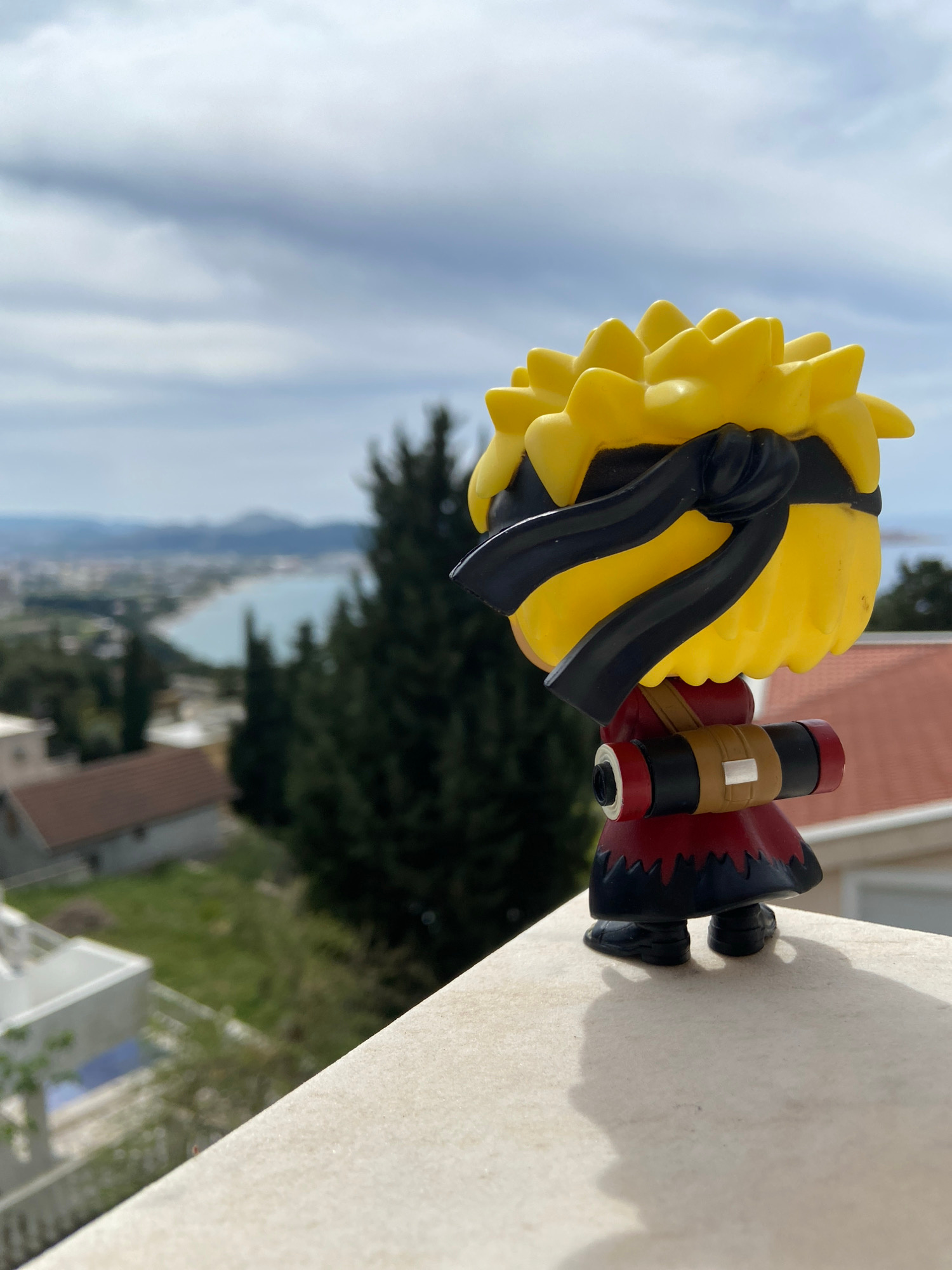 The image depicts a Naruto Uzumaki figurine positioned on a balcony ledge in Šušanj, Montenegro. The figurine is facing away from the camera. In the background, there is a view of the Adriatic Sea and…read more
