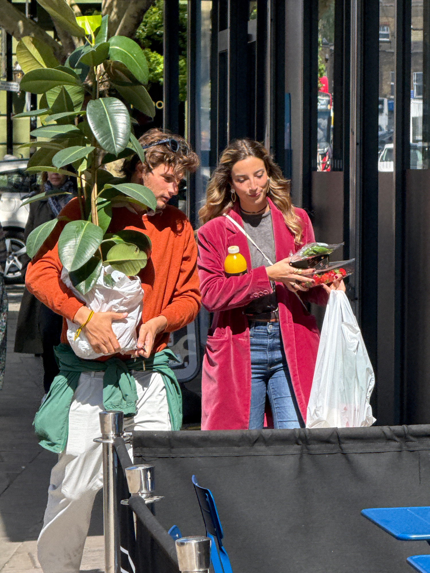 A passerby in London, UK, captured an outdoor scene on a sunny day. A fair-skinned woman with brown hair is wearing a pink velvet jacket over a gray shirt and blue jeans, holding a package of strawber…read more