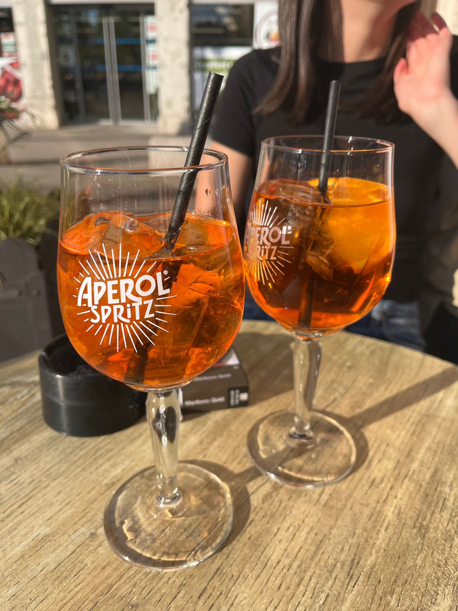 Two Aperol Spritz cocktails, each with a black straw, sit on a wooden table. A woman is partially visible in the background. The scene appears to be located in Lyon, France, evidenced by the backdrop…read more