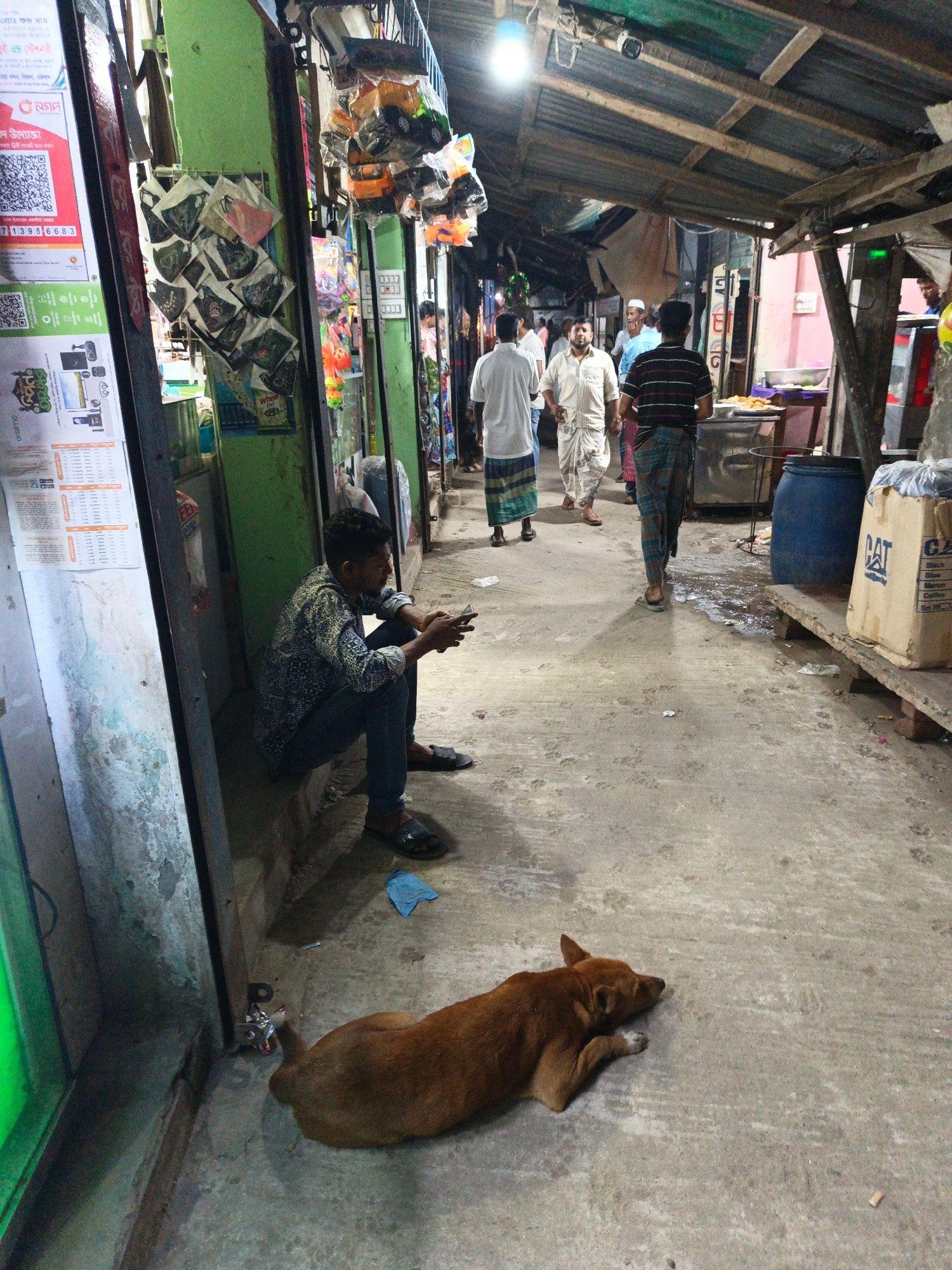 A medium-shot captures a narrow outdoor market scene in an undisclosed city within Bangladesh. In the foreground, a young man is seated on a step, leaning against a light green wall while focused on h…read more