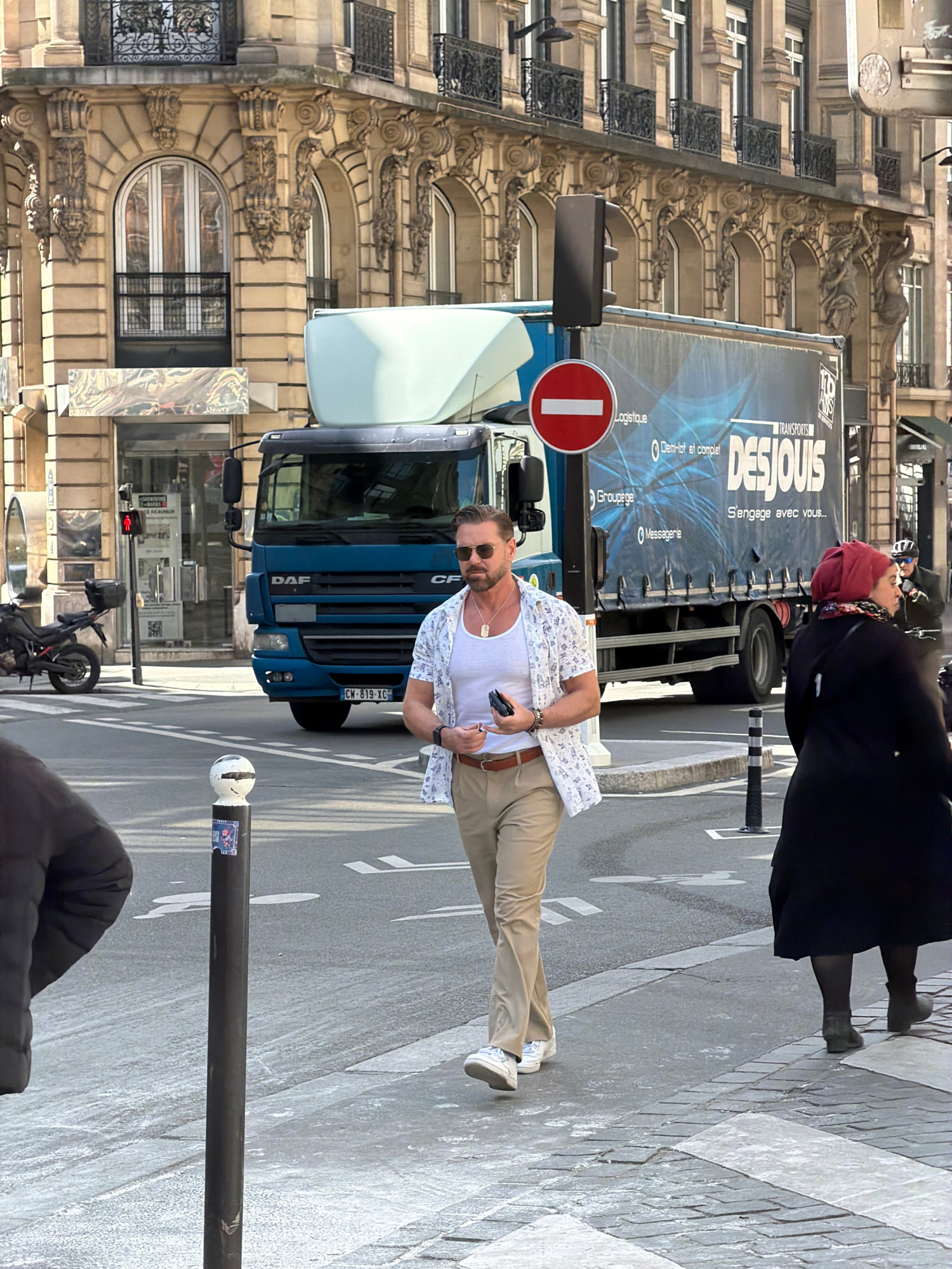 The image depicts a street scene in Paris, France. A man stands on the sidewalk near a large blue truck with the branding "TRANSPORTS DESJOUIS" prominently displayed. The truck is parked beside a building with ornate, classical architectural details. The man is wearing sunglasses, a white t-shirt, a patterned shirt, and khaki pants. He is holding a cell phone in his hand. A woman wearing a black coat is walking in the same direction as the man. There is a black pole with a white top on the right side of the image and a parked motorcycle partially visible in the foreground. A red "no entry" sign is attached to the truck. The license plate "CW-819-XC" is visible on the truck's front. | Open Wire
