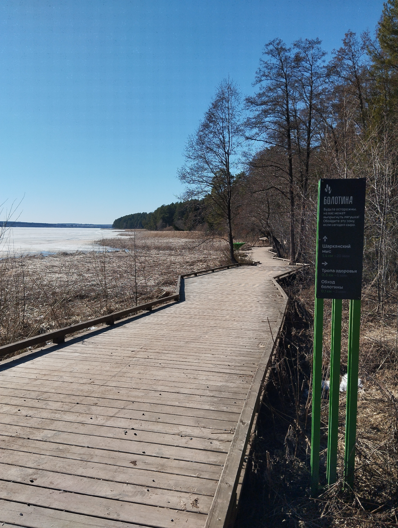 The image depicts a wooden boardwalk pathway winding alongside a partly frozen lake and a forest edge, under a clear blue sky. A signpost with green posts and a black sign provides information in Russ…read more
