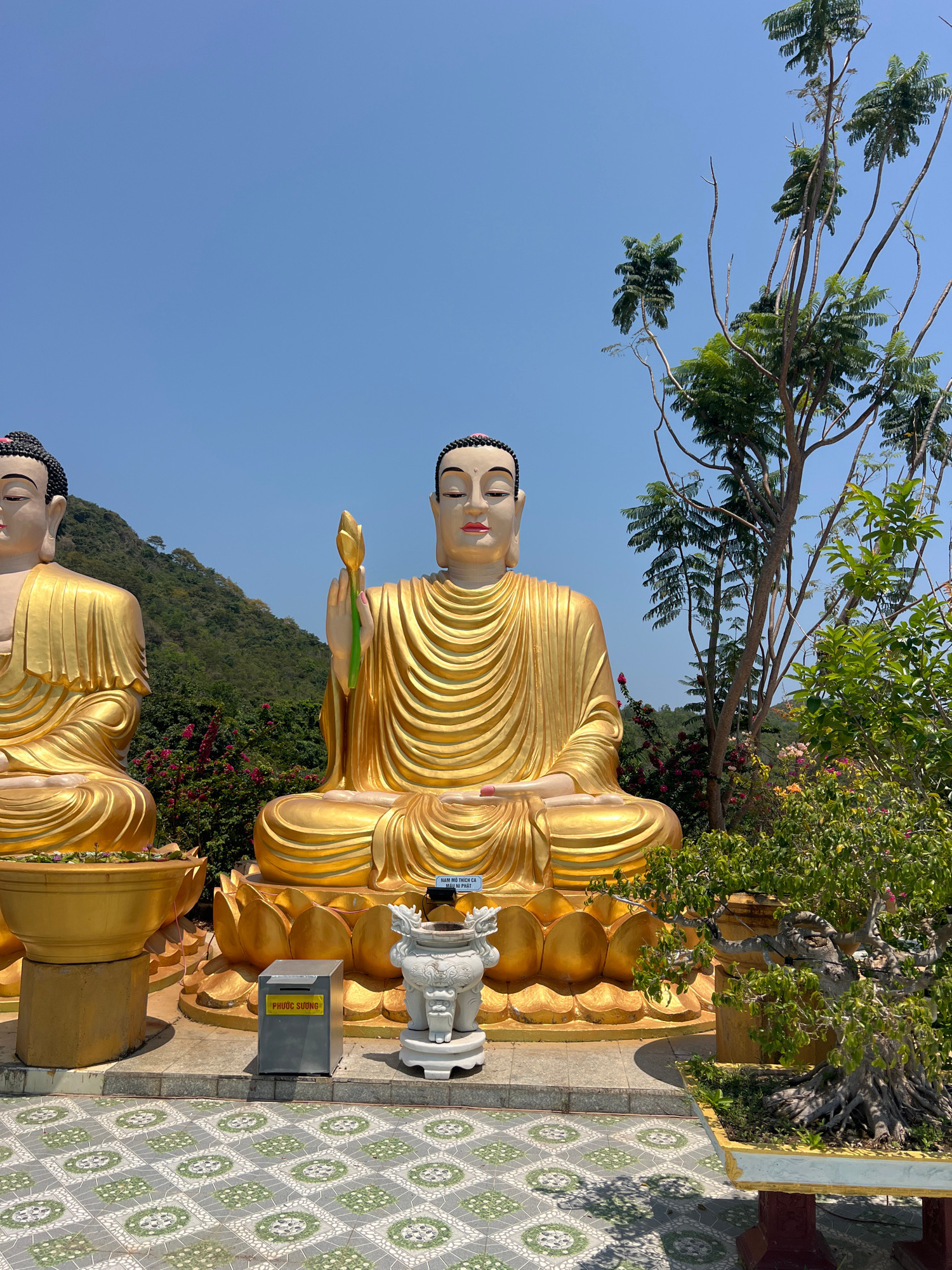 The image depicts a golden Buddha statue at Long Son Pagoda in Nha Trang, Vietnam, set against a backdrop of blue sky and lush greenery. The statue, detailed with concentric lines to mimic fabric folds, is posed in a seated position on a lotus throne. Another golden statue can be seen in the lower portion of the image, partially cropped. A tree with sparse foliage is positioned in the upper left, while denser foliage appears behind the statue to the right. A small donation box and an incense burner stand near the statue on a tiled patio. The background includes a hill with dense vegetation and patches of red flowers. | Open Wire