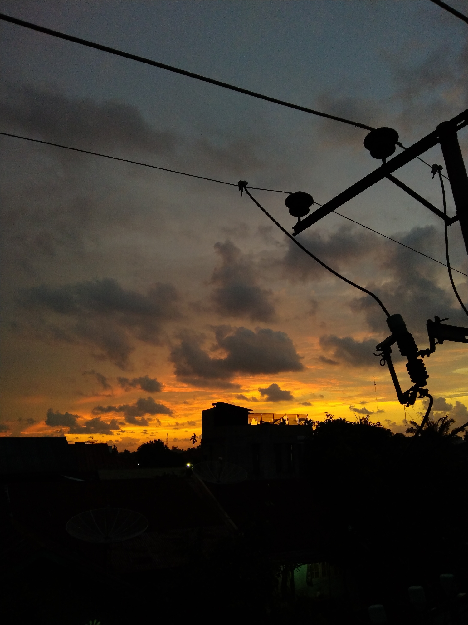 The image captures a dramatic sunset over a residential area in Bireuenmeunasahdayah, Indonesia. The sky is dominated by a deep orange and yellow glow near the horizon, gradually transitioning to darkβ¦read more