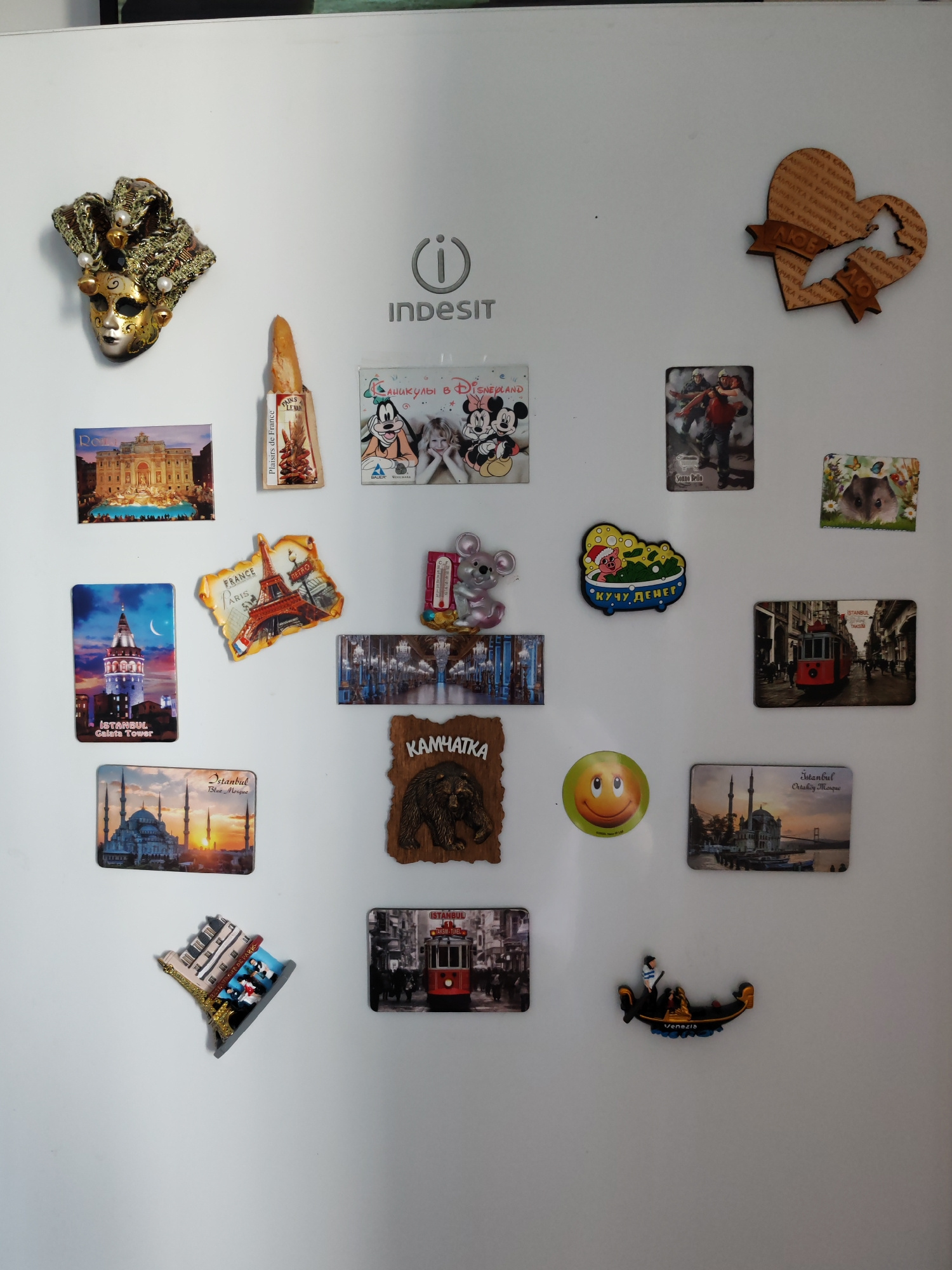 A white refrigerator door is covered with a collection of diverse magnets, predominantly souvenirs from various international travel destinations. The scene depicts a personal display of memories and…read more