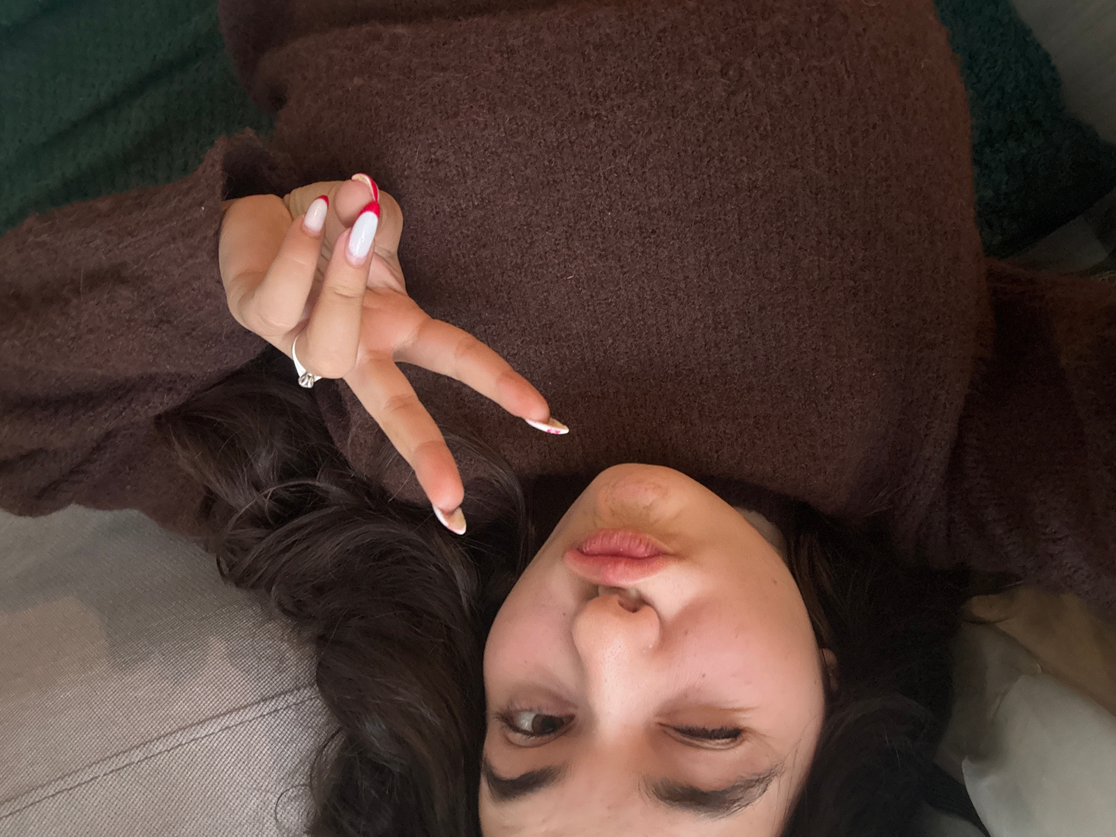 A woman with dark hair and fair skin lies on a gray surface with a brown sweater. She is making a peace sign with her fingers. Her nails are white with a red tip. She is winking with one eye and pucke…read more
