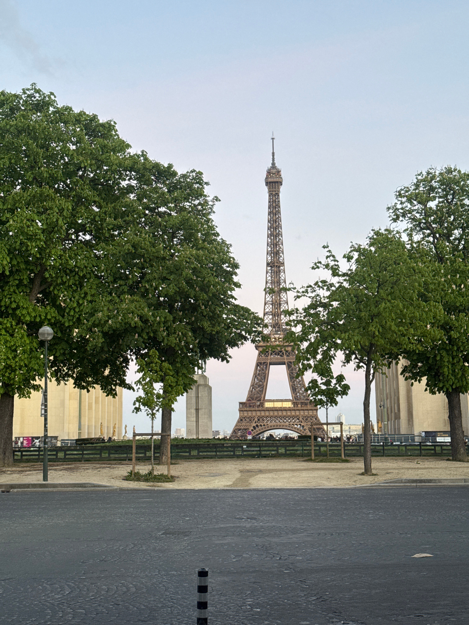 The Eiffel Tower is visible in the distance, framed by trees. The foreground features a road with pedestrian walkways, separated by a fence. Several buildings are located to the right of the Eiffel To…read more