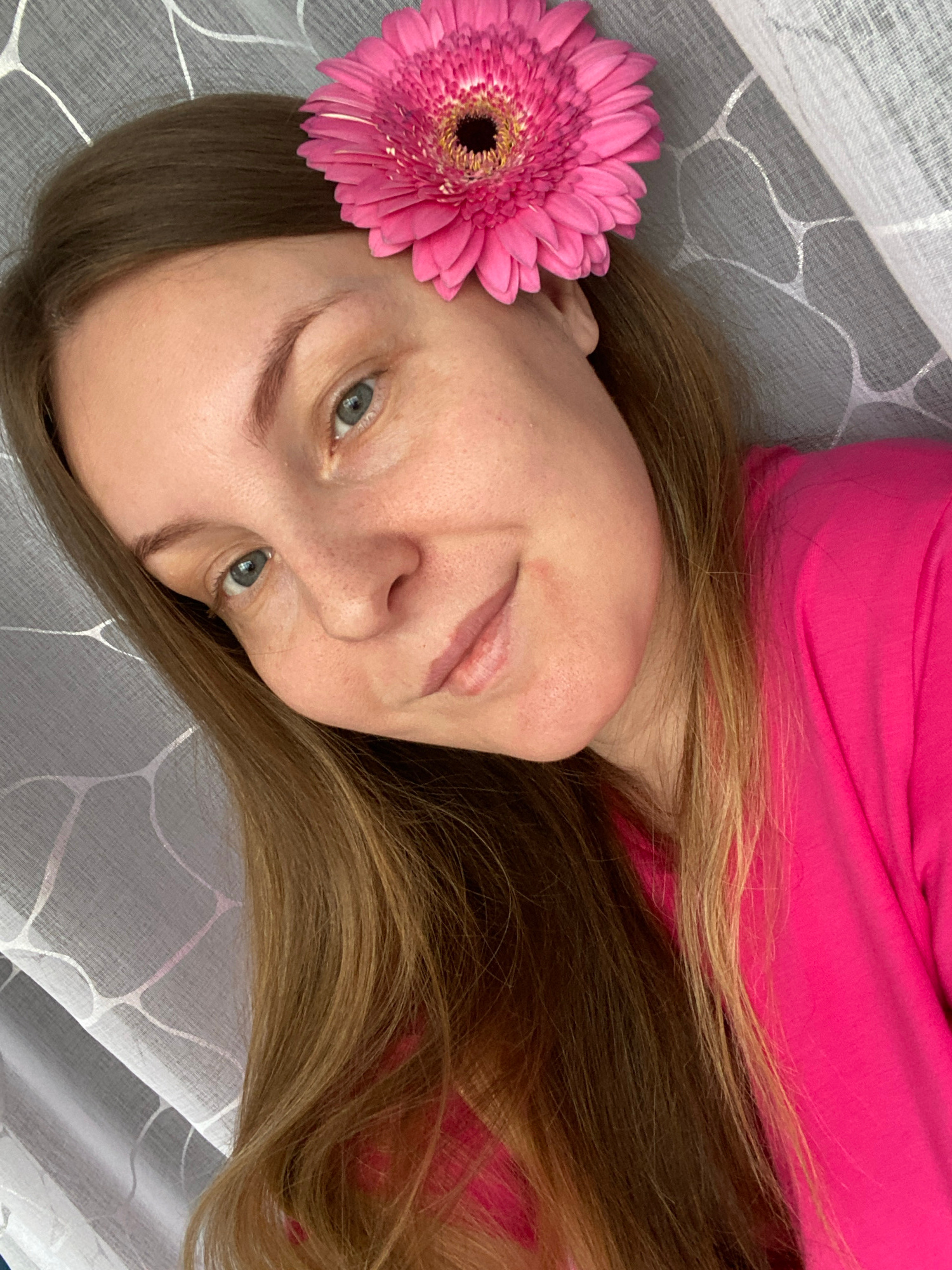 A woman lies on a gray patterned fabric. She wears a bright pink top. A pink gerbera daisy is near her ear. Her hair is brown with blonde highlights.