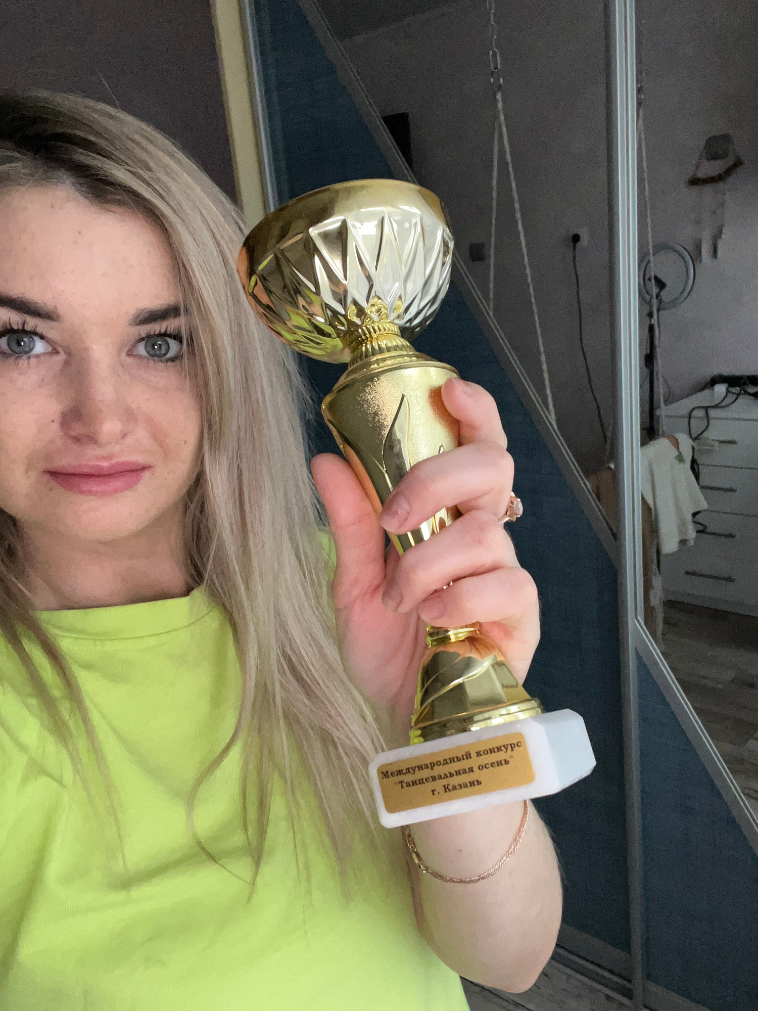 A woman with blonde hair and blue eyes is holding a gold-colored trophy. The trophy has a white label on the base with Russian text that includes "Международный конкурс Таиппевальнвя осень г. Казань",…read more