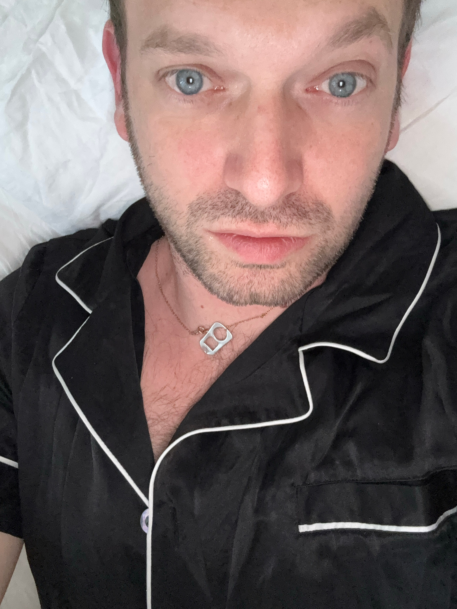 A close-up, top-down photograph depicts an adult male lying supine on white, wrinkled bedding in a location identified as Erba, Italy. The subject has light skin, blue eyes, and light brown eyebrows,…read more