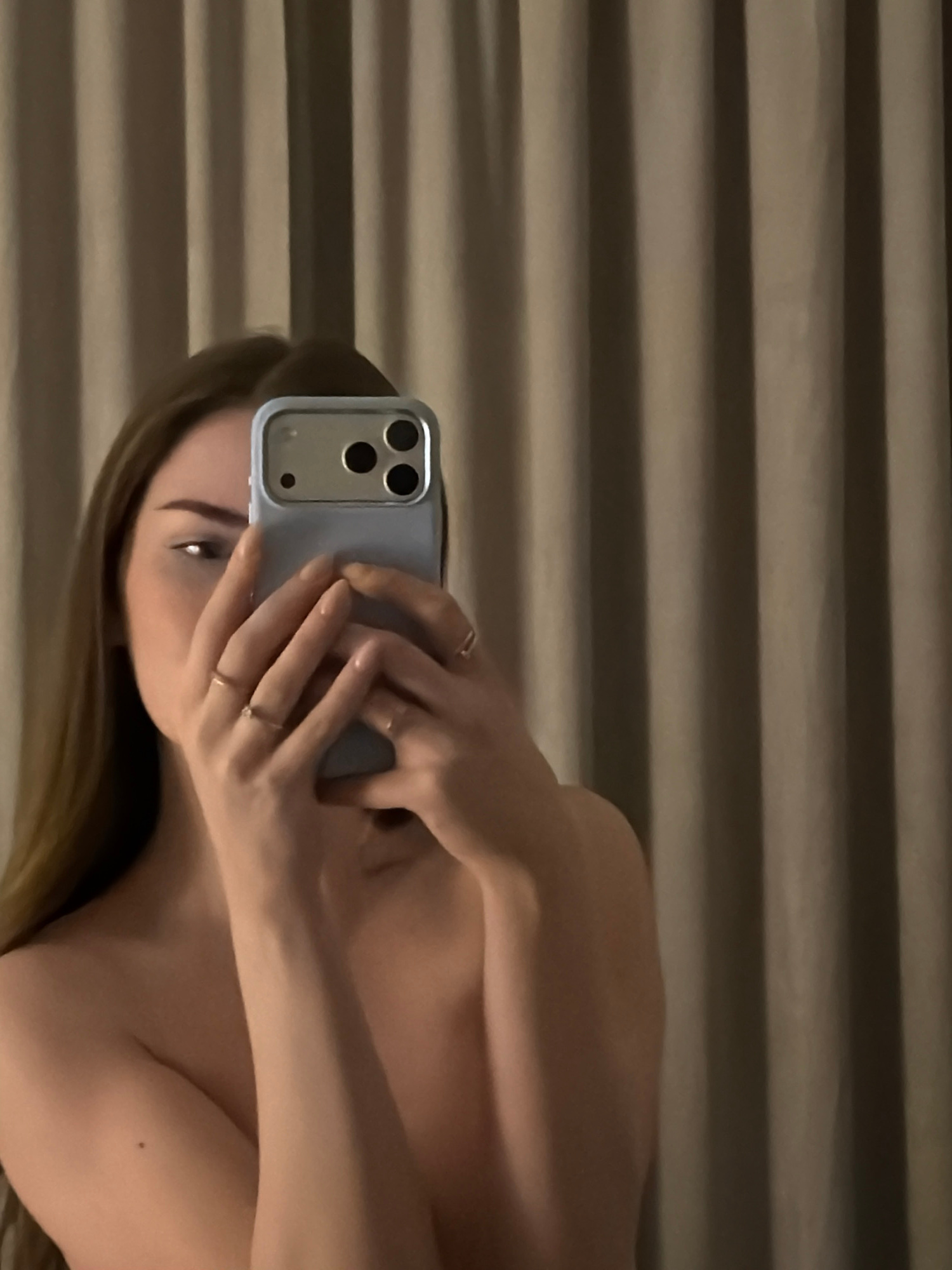 The image displays a person taking a mirror selfie with a smartphone, oriented sideways, with the subject's head on the left and body extending to the right. The individual appears to be female, with…read more