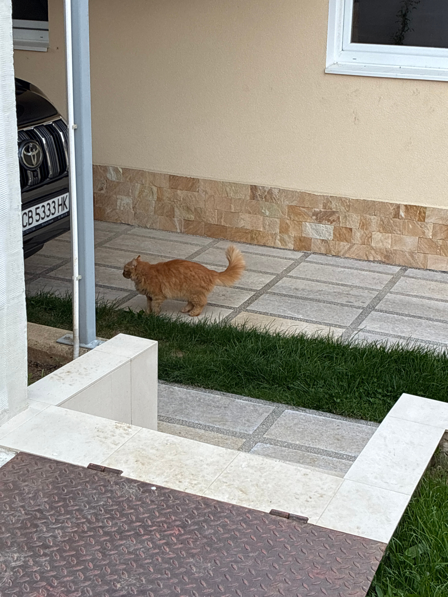 The image presents an overhead view of an outdoor scene in Berkovitsa, Bulgaria, during daytime with clear weather. The central subject is an orange or ginger cat, seen walking on a paved pathway. Theβ¦read more