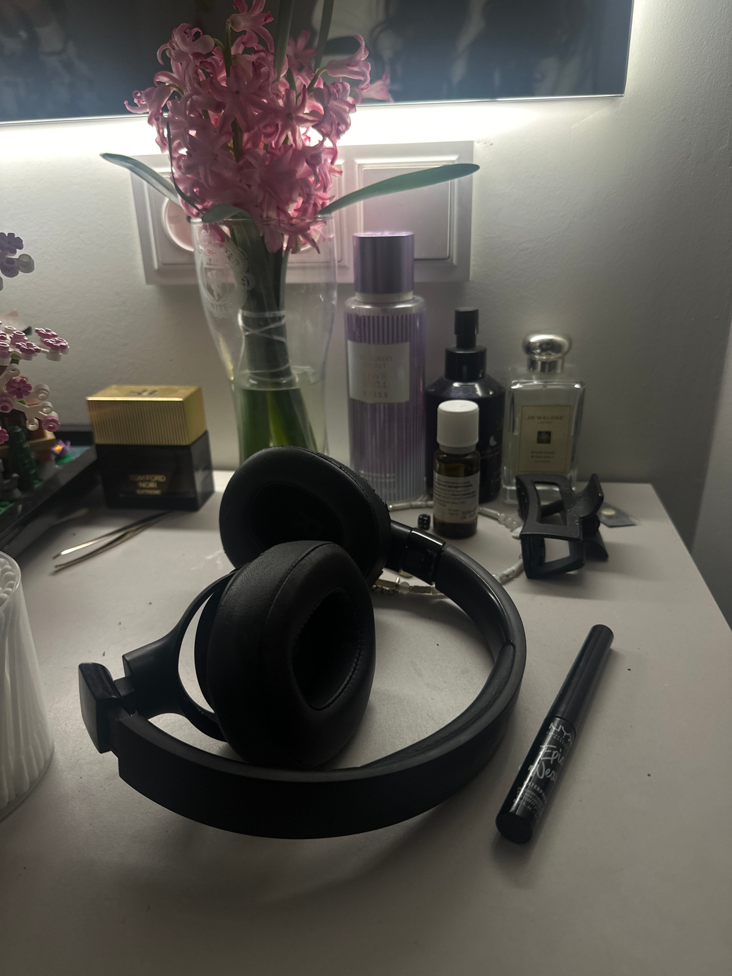 The image shows a tabletop cluttered with various personal items. From left to right, there is a vase with pink flowers, several perfume bottles of different shapes and sizes, a black hair clip, a bla…read more