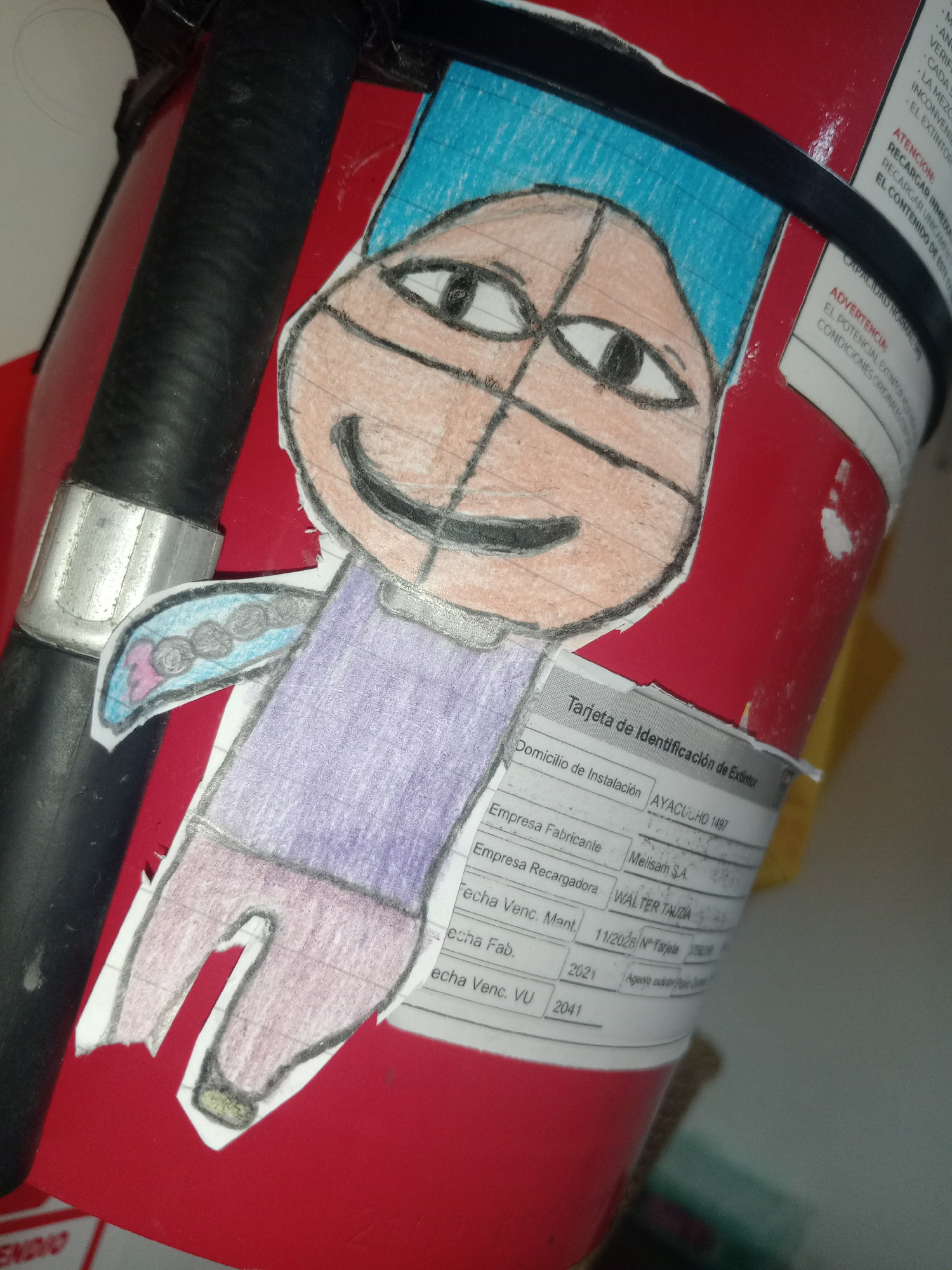 A close-up shot shows a red fire extinguisher with a hand-drawn, cartoonish character attached to it. The character has a round, tan-colored face with black-outlined eyes, a black semi-circular smile,…read more