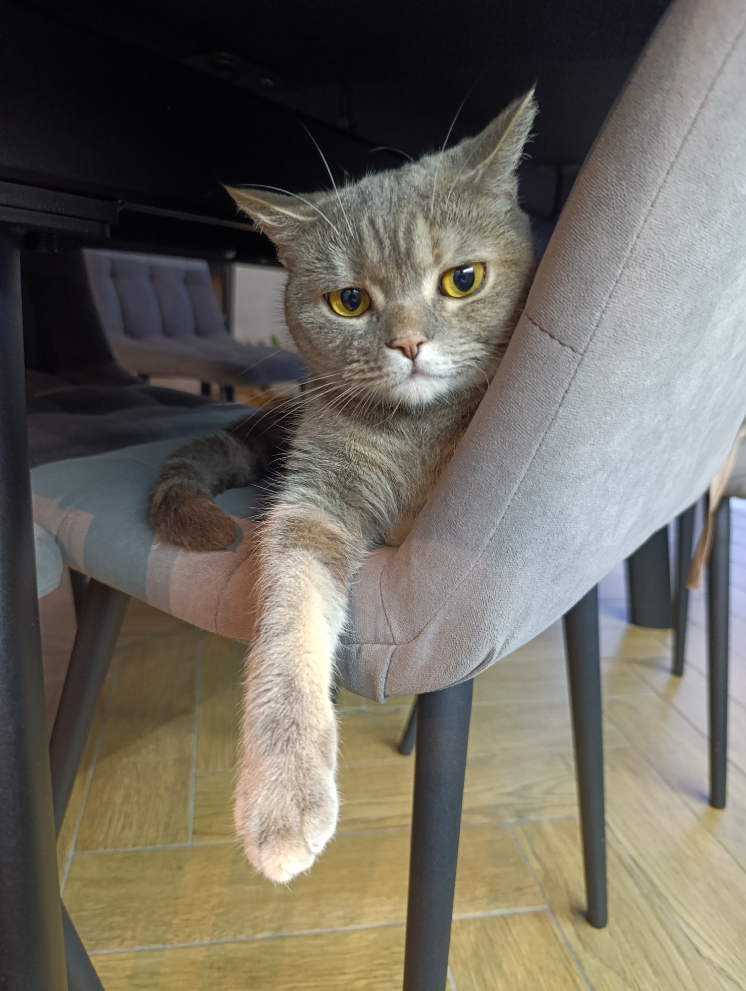 A medium shot captures a gray British Shorthair cat lounging on a gray upholstered chair, positioned under a dark-colored table. The cat's right paw is extended downward, resting outside the chair. Th…read more