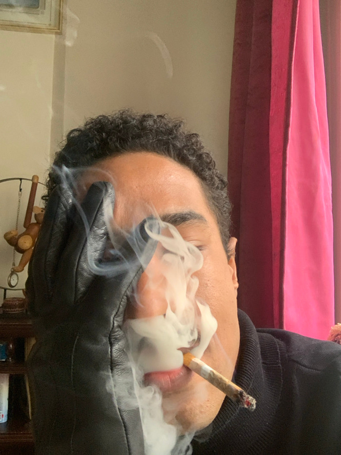 An individual with curly black hair is holding a lit cigarette to their mouth. Smoke is prominently visible around their face and mouth, obscuring parts of their features. The person is wearing a darkβ¦read more