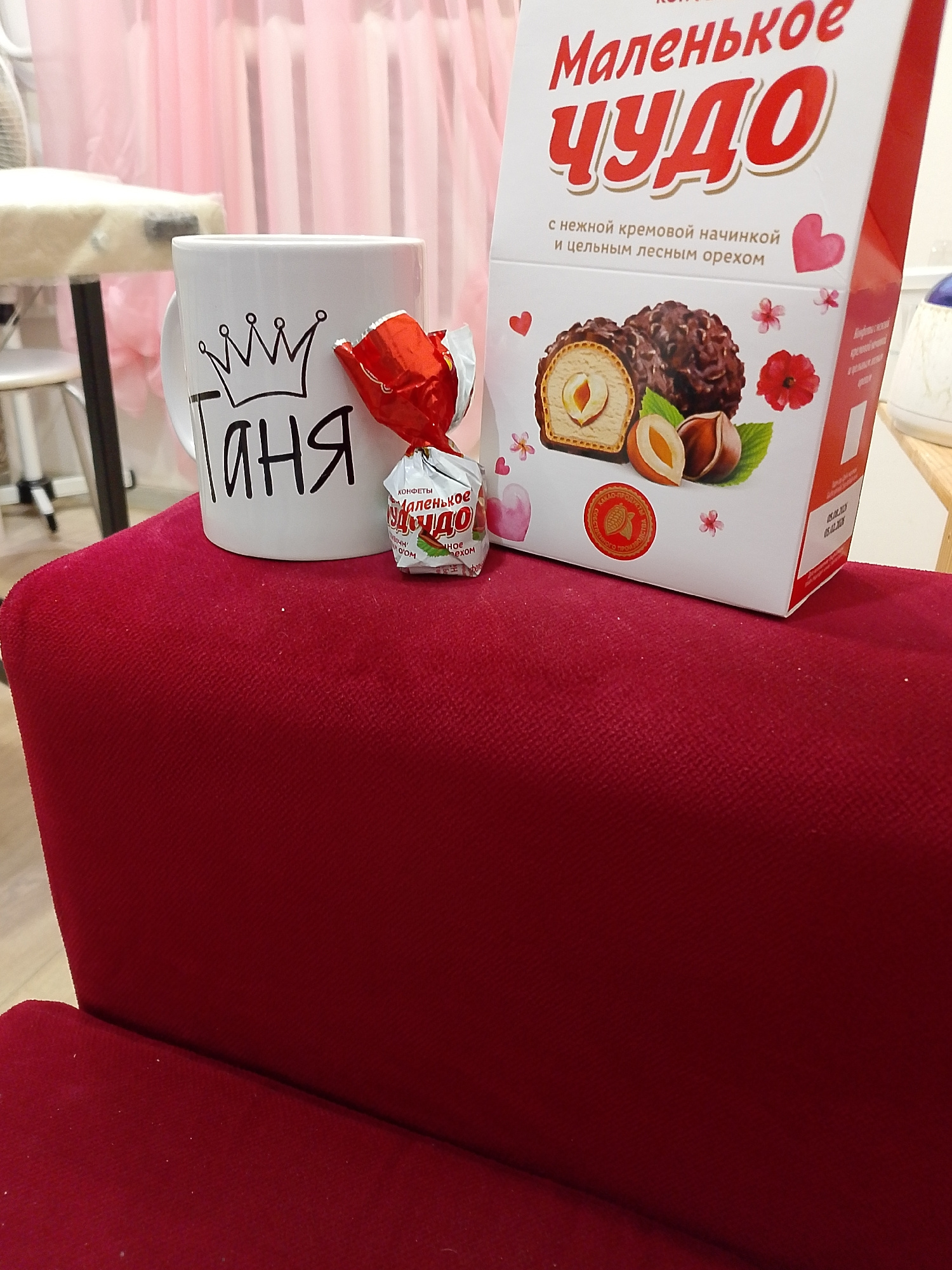 An indoor scene in Chaikovsky, Russia, features a white mug and a box of chocolates, both centered on a deep red upholstered surface, likely a chair or sofa. The mug, adorned with a black outline of a…read more