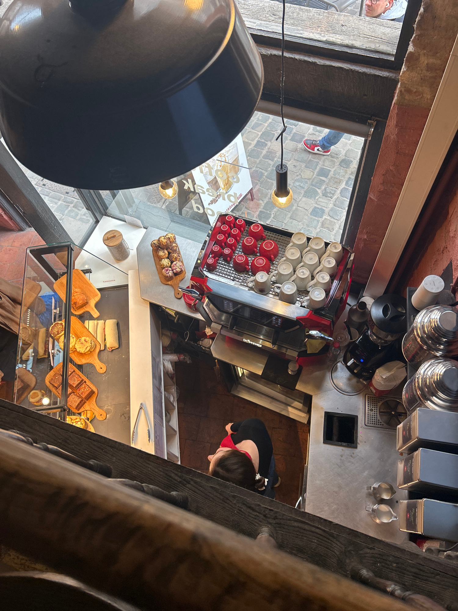 Captured from an elevated perspective, the image depicts the interior of a café or bakery in Lille, France. The scene is framed by a window that reveals a cobblestone street and glimpses of pedestrian…read more
