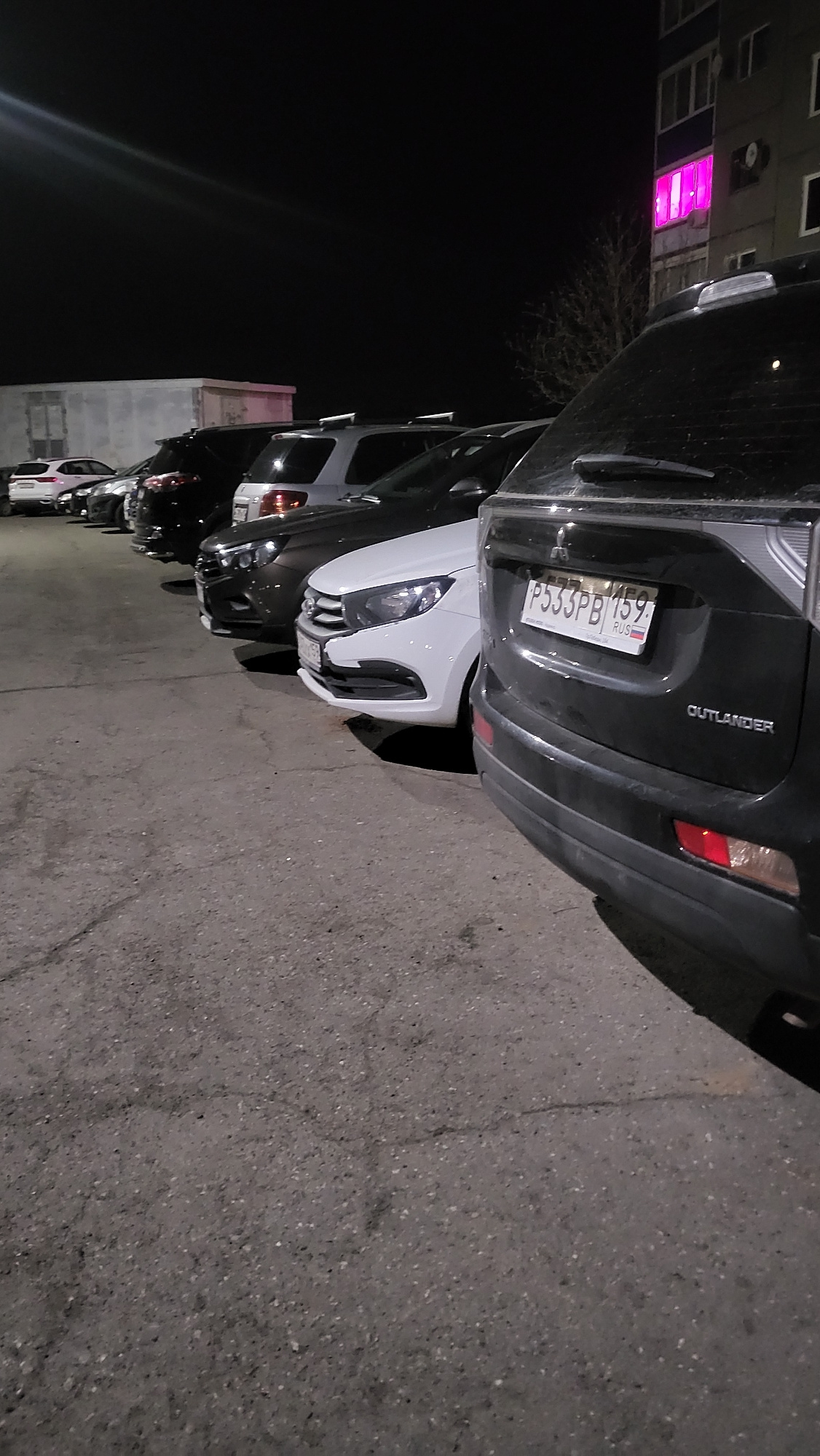 The image shows a row of parked cars at night. The first car is a dark-colored Mitsubishi Outlander, identifiable by the "OUTLANDER" badge. Its license plate reads "P533PB 159 RUS." Behind it is a whi…read more