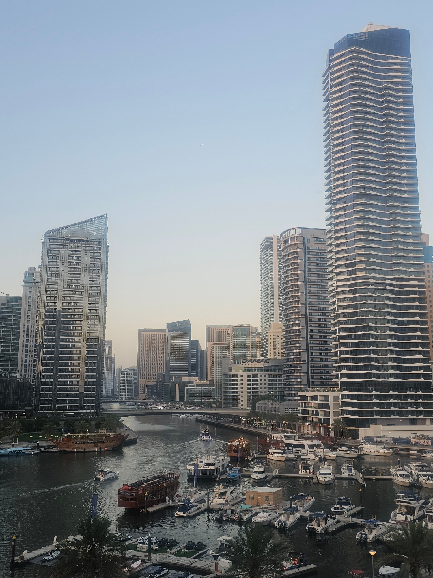 The image, best viewed horizontally, presents a panoramic view of a modern urban waterfront, characteristic of Dubai. Towering skyscrapers line a busy waterway, likely a marina or canal. On the left,…read more