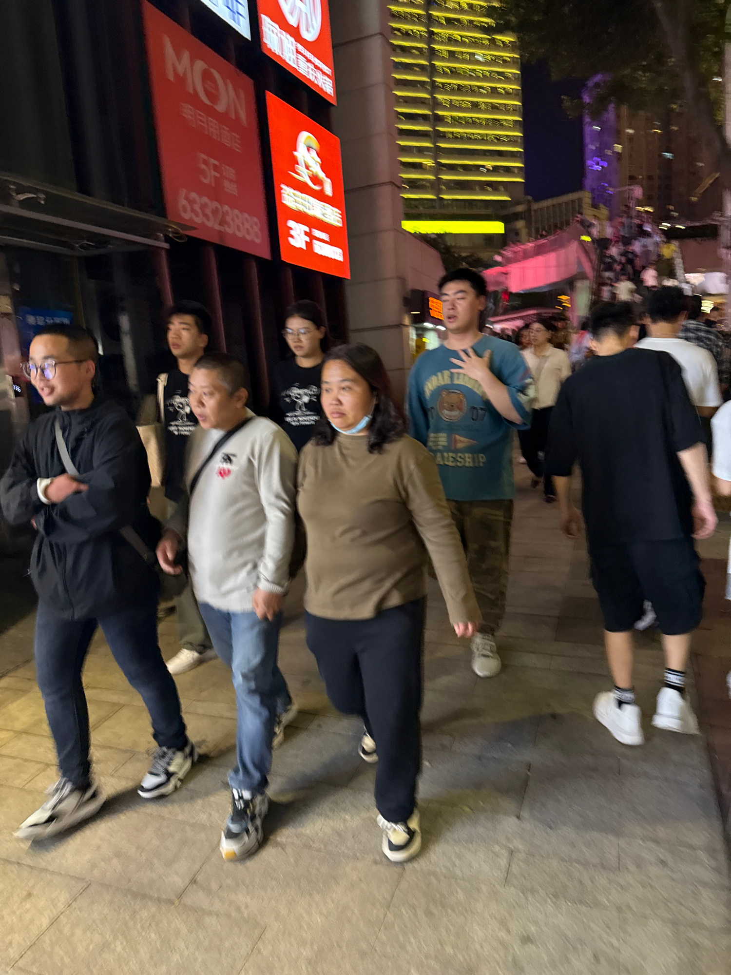 This media file captures a nighttime street scene in an urban area, likely Yuzhong District, China, showing a group of East Asian individuals standing on a paved sidewalk. The image is oriented vertic…read more