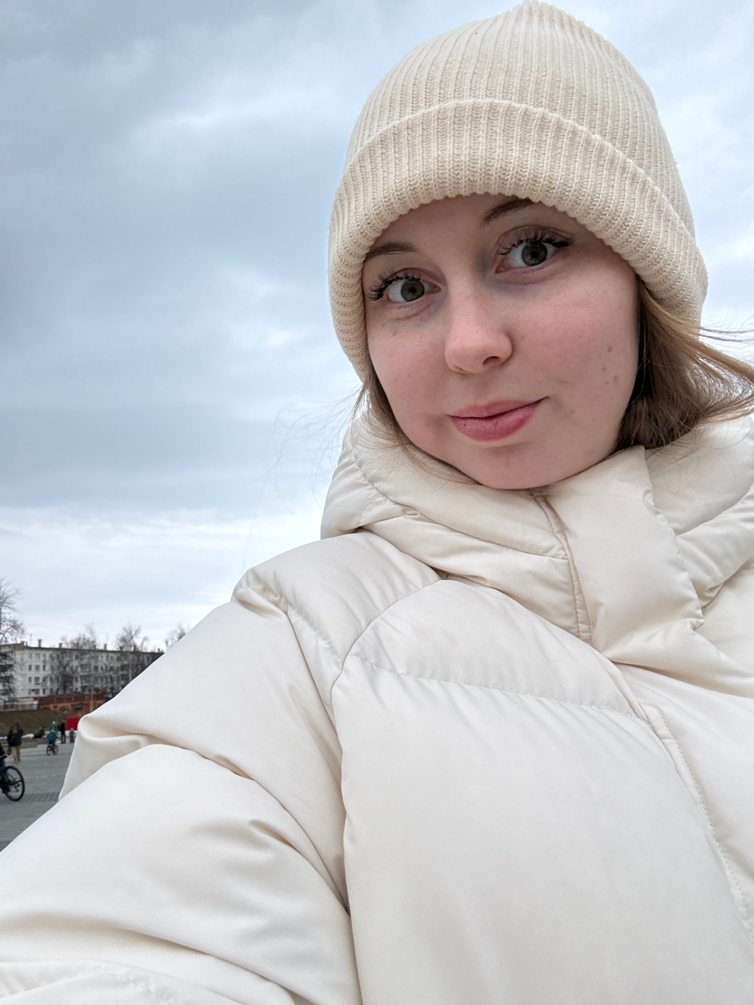 A fair-skinned young woman with light-colored hair and green eyes is seen in a selfie. She is wearing a light-colored beanie and a puffy white jacket. The background features a cloudy sky, and in the…read more